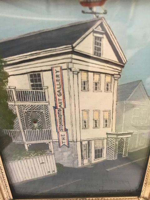 Miniature framed painting of the Stonington Art Gallery in Stonington Borough. View is from the northern side with the next house down visible on the right. Also known as 22 Pearl Street. Red ship weathervane is visible on the roof and the banner proudly displayed on the left. Painting measures approximately 3 x 4 inches.Collection