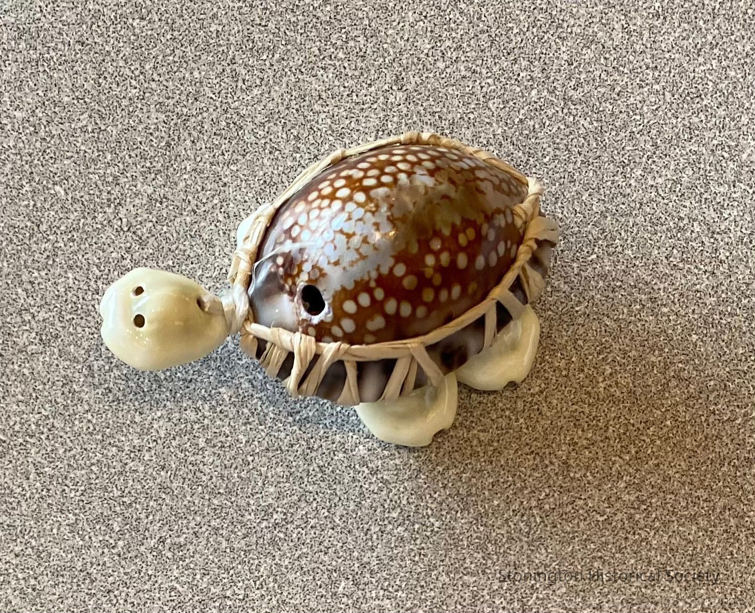 Turtle figurine fashioned from shell, made in Tabuaeran 2006. Tabuaeran is an island in the central Pacific, also known as Fanning Island. Captain Edmund Fanning of Stonington was the first European to spot the island from his ship Betsy on June 11, 1798, and it was named for him.