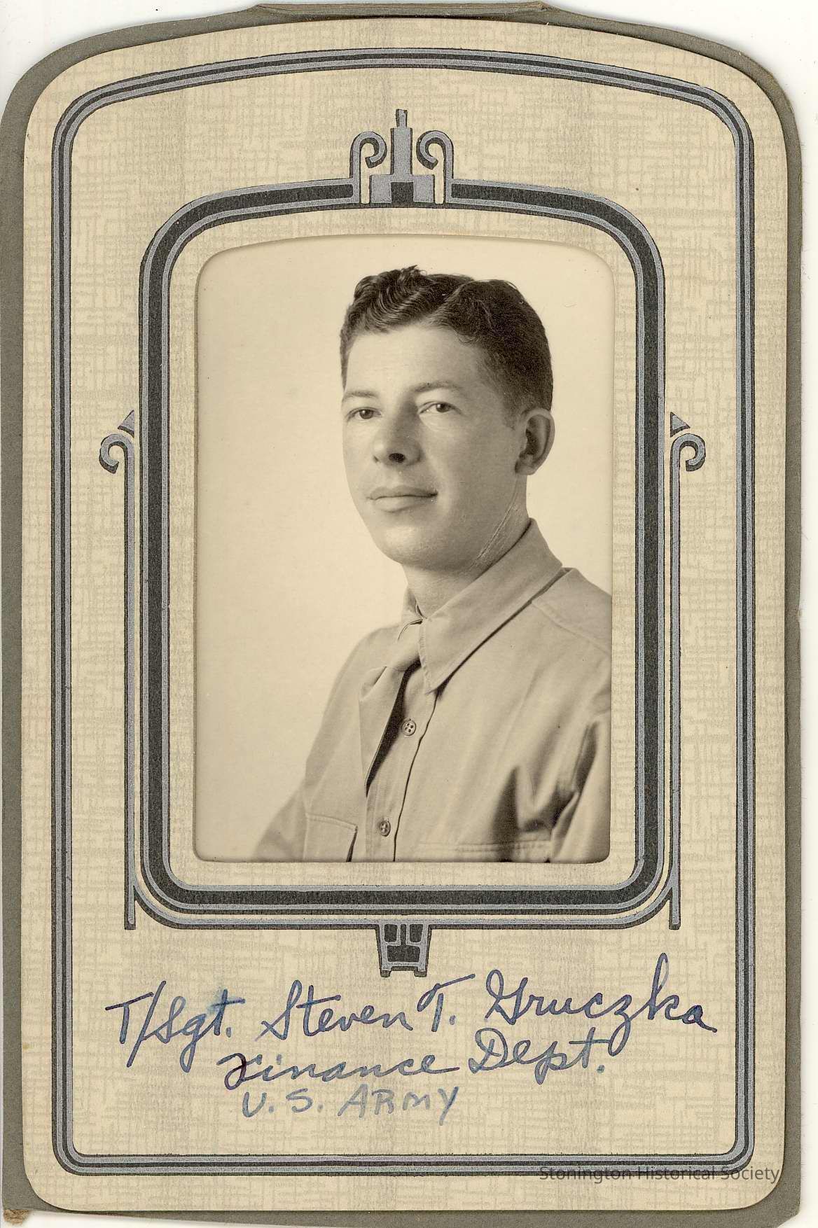 Photo of Steven T. Gruczka, T/Sgt., Finance Dept. US Army. In cardboard frame.
