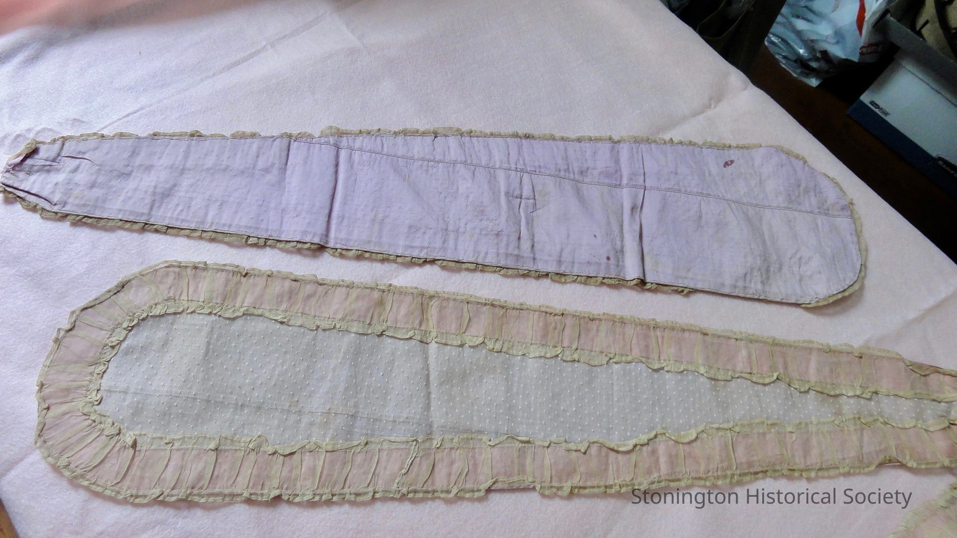 Ceremonial Collar 80 inches in length including the 30 inch lappets machine made 1 1/2 inch cotton gauze ruched trim pink silk ribbon, pink silk fa and dotted swiss fabric components