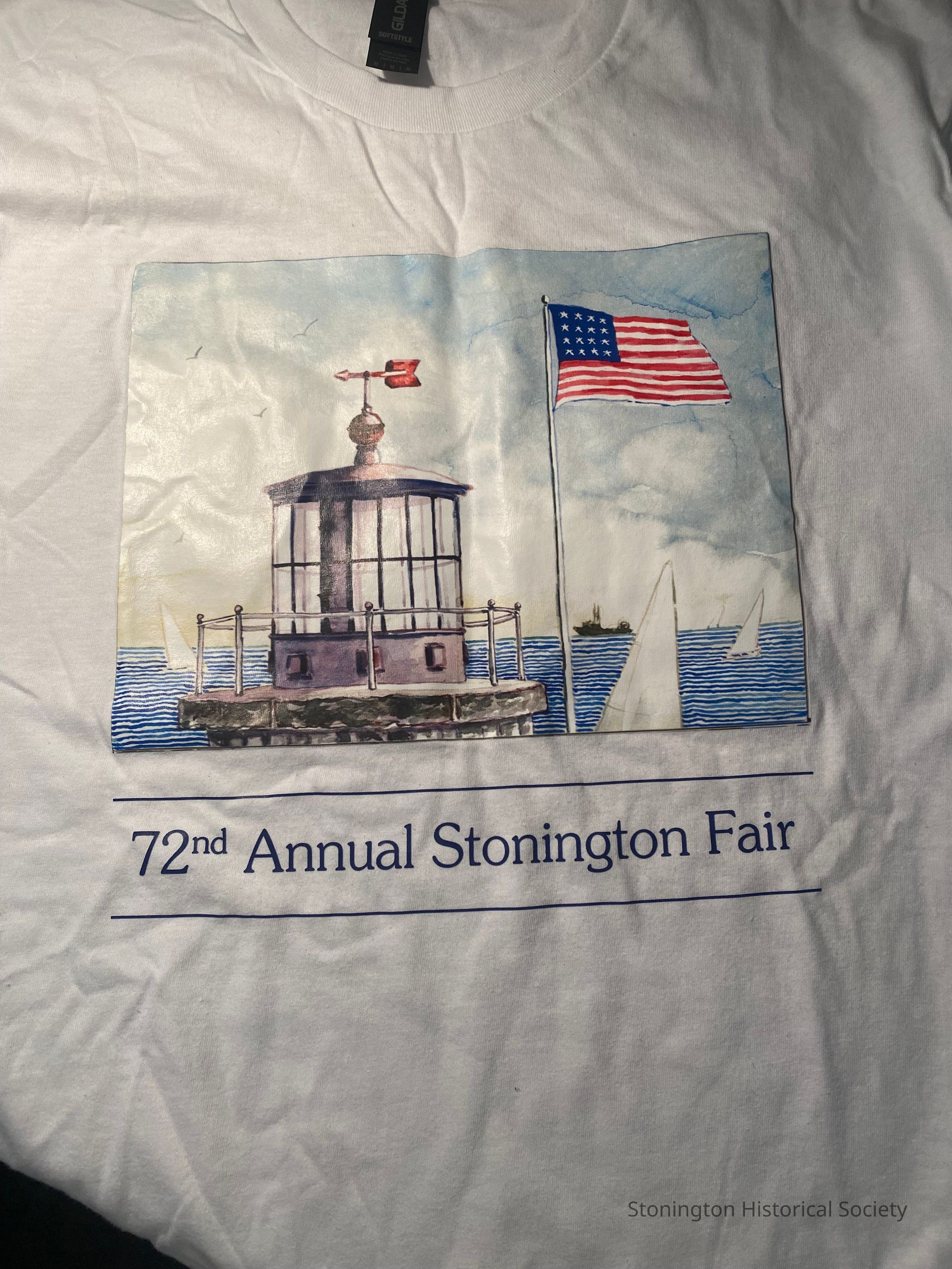 T-shirt from the 72nd annual village fair, held on August 3, 2024. Artwork done by local artist, Susan Scala. The event is held annually in Wadawanuck Square and is sponsored by the Stonington Como. Back of the t-shirt lists corporate sponsors of the event: Bob Valenti Family of Dealerships, Breezeline and Stratedia.Collection