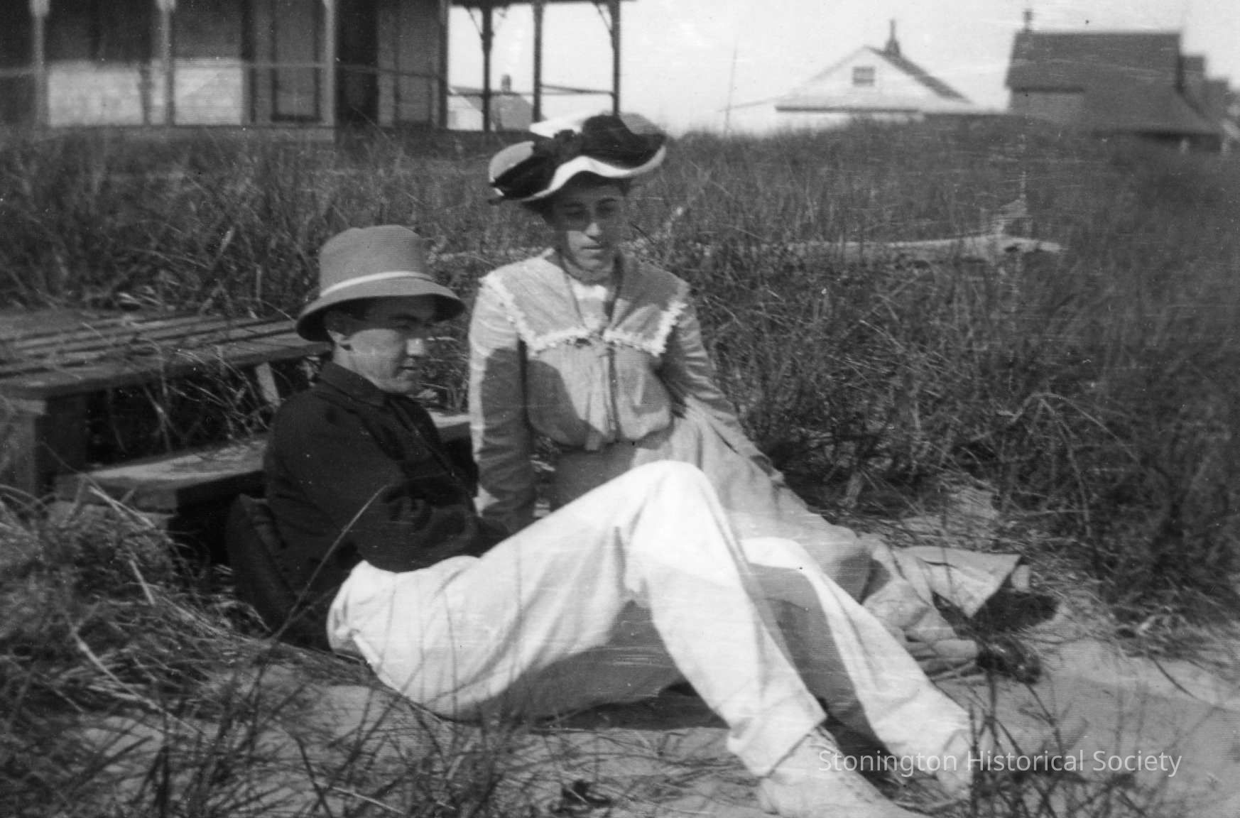 Charles Hull Anderson and his wife, Libby Fitch Anderson sitting in the dunes outside the Anderson family beach home. Could be in Misquamicut or Wamphassuc Point. Charles is the son of Jerome S. and Emma Horn Anderson.