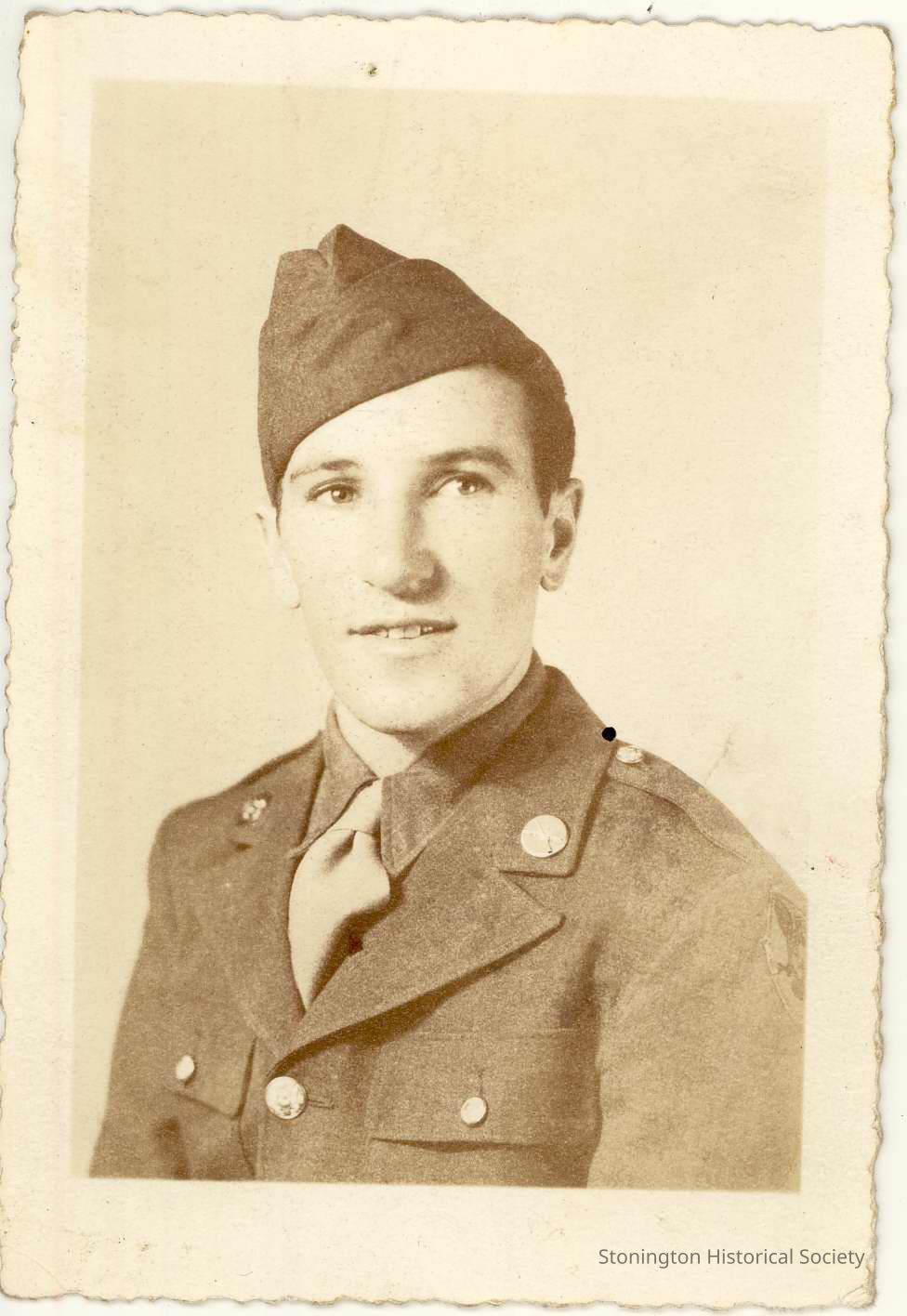 Photo of Aires Pont, Pvt. Notes on back giving address in Texas, dated May 1, 1943, Mrs. Jeal Pont, 9 Gold Street, Stonington Conn. is mother