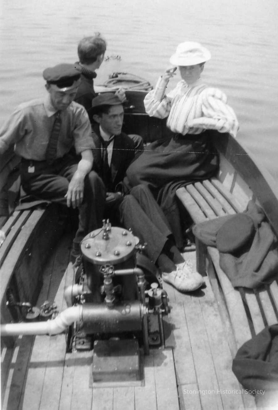Group photograph in Doug Anderson's boat "Sliver". People gathered left to right: Doug Anderson, Carl Anderson(looking backwards), Eugene Anderson and Carl's wife, Nell. A good example of boat mechanics, as the engine is visible.