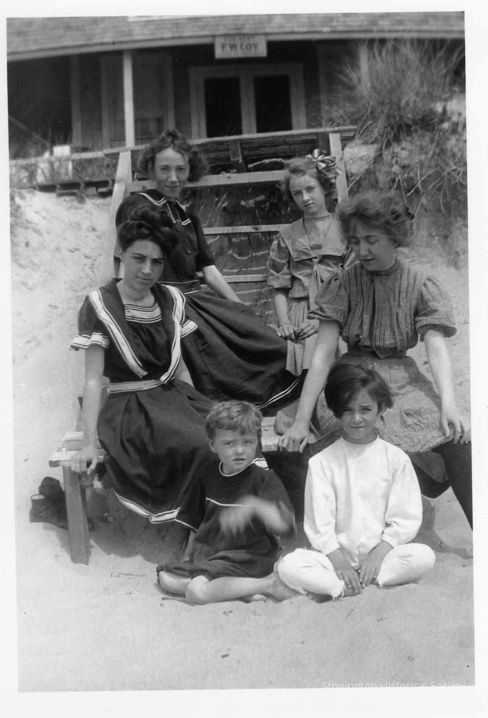 Group photograph of children on the steps of a beach house. Robert P. Anderson is the child in the middle on the bottom. Emma Varina Anderson is in the middle right. All others may be Andersons from Noank.