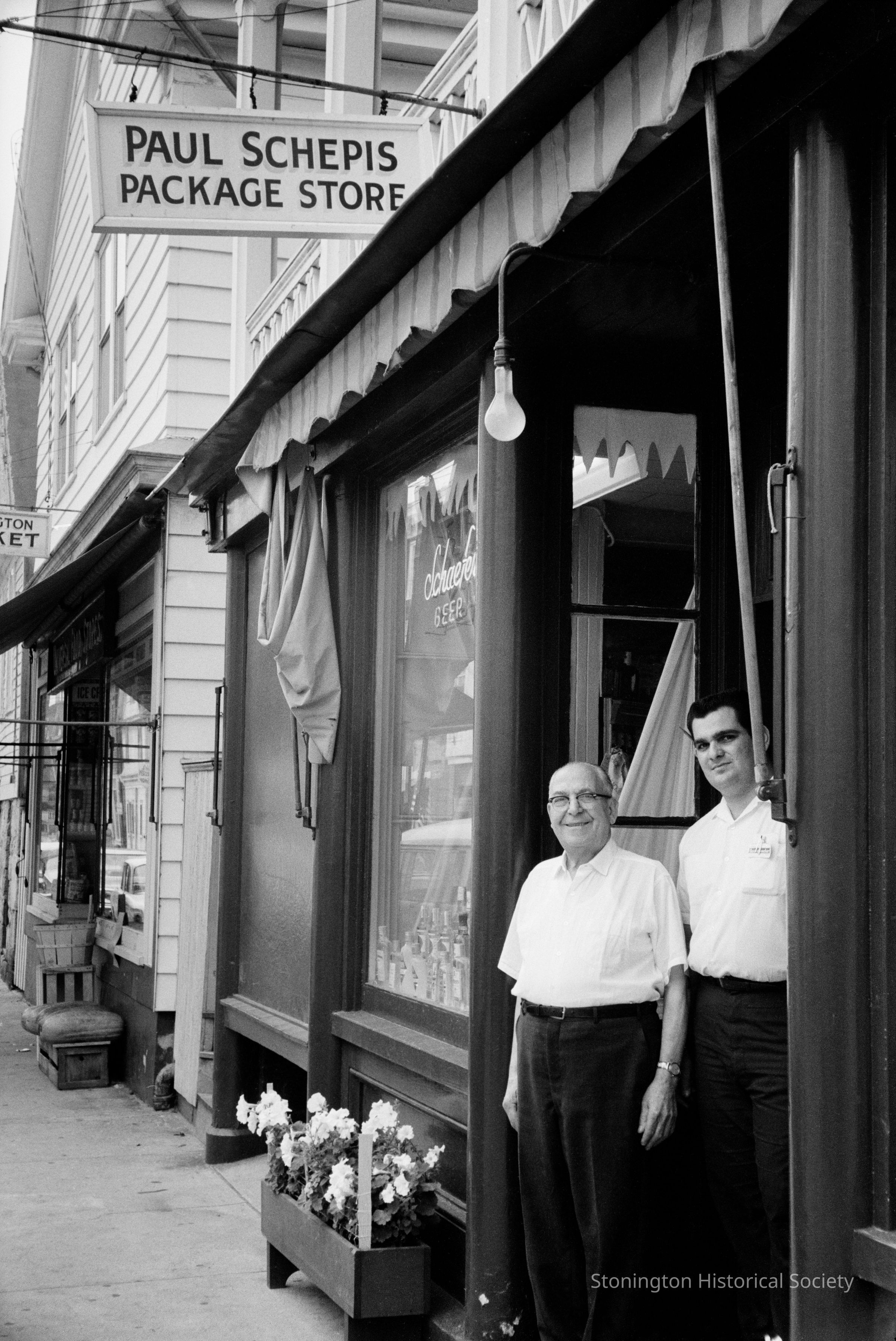 Image is of Paul Schepis and his son-in-law, Charlie Chiappone in front of Paul's package store in the Borough. Schepis' was THE liquor store in the Borough and was where everyone of a certain age went to purchase alcohol once they were of age.Collection