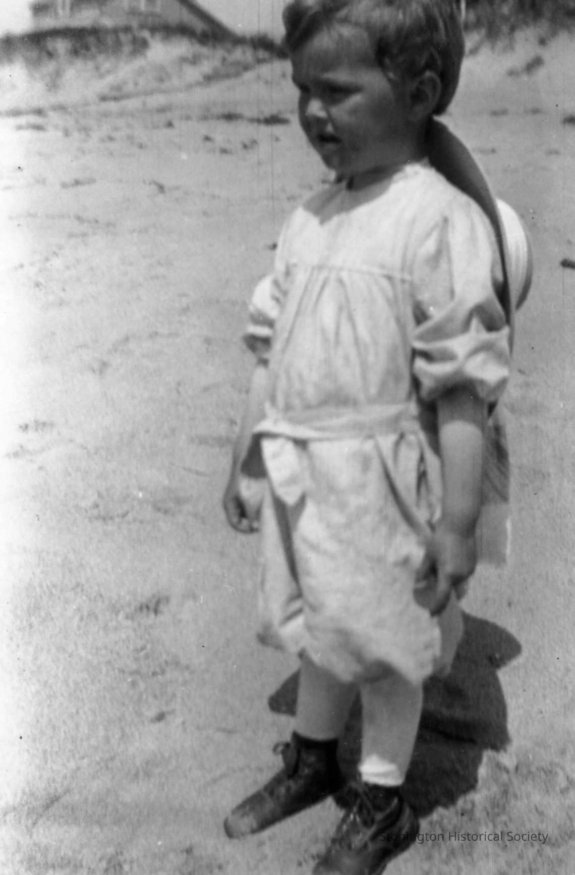 Robert P. Anderson standing on the beach as a young child. A beach house is visible in the background. Good example of children's clothing.