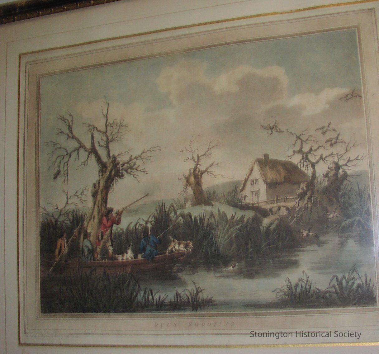 Paper mezzotint print, framed in black & gold frame, entitled "Duck Shooting" by George Morland. Lower left "Published . . . 1822. The print features four men hunting ducks. One man is in firing position and has shot a duck, which is falling fro the sky. The men are in a boat on a river. In the background is a thatched cottage and dead trees.Collection