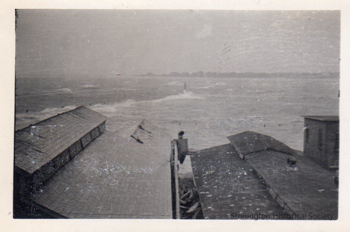 Black and white photograph of waves breaking over the breakwater during the 1938 Hurricane. From photograph album of Bertha D'Amico.