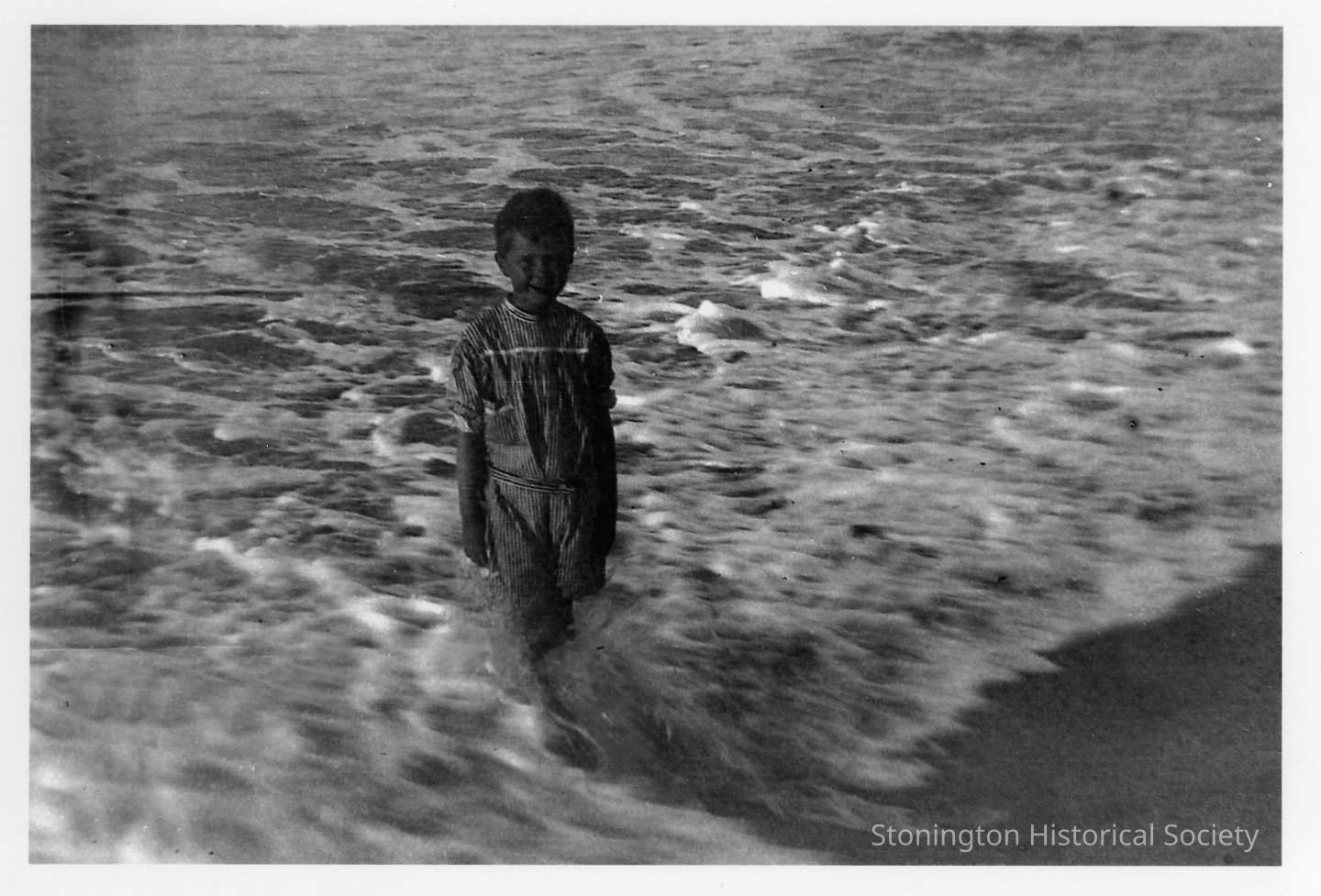 Robert P. Anderson standing in the ocean as a little boy. Good example of children's clothing and swimsuit at the turn of the last century. There are two copies of this photograph.