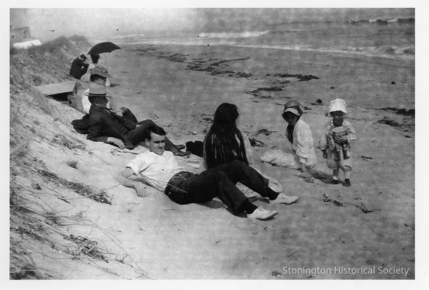 Group picture on the beach. Charles Hull Anderson lounges nearest to the camera. The woman with her back turned and her hair down is probably his wife, Libby Fitch Anderson. The small child on the far right is most likely Robert P. Anderson. The woman in the white dress on the right is most likely Jessie Ashby Anderson, and the two older people sitting on the left are probably her parents.