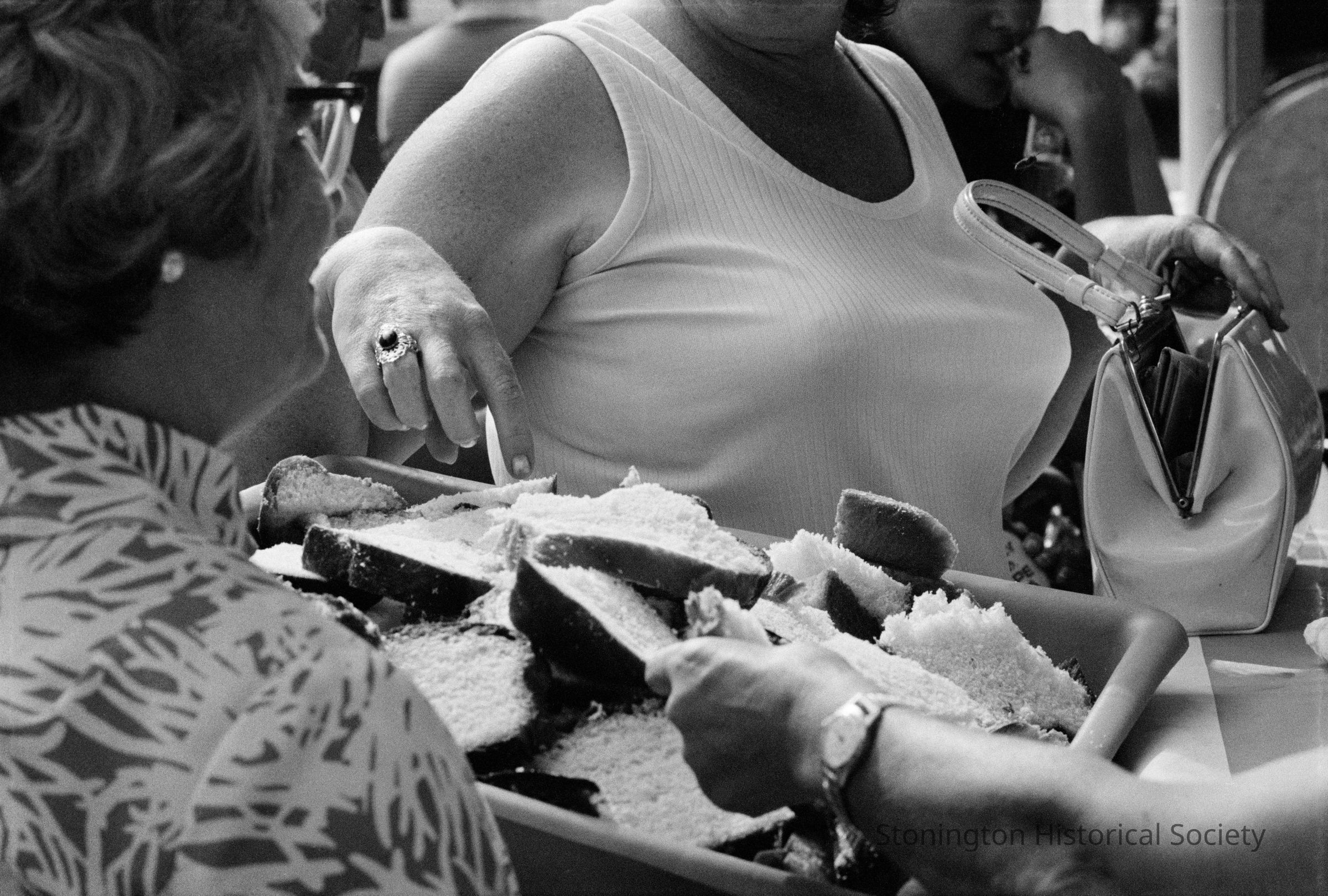 This photograph depicts a group of women around a tray of Portuguese sweet bread. An interesting photograph in that it does not focus on any woman's face, but on the bread. The main subject in the white tank top is reaching for a piece, and in the other hand, holding her purse open. Another arm reaches in from the right.Collection