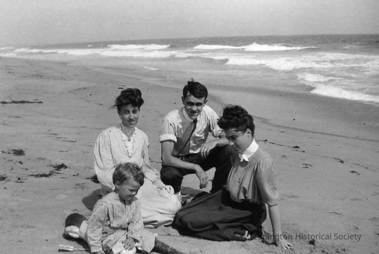 Group photograph on the beach. Left to right: Robert P. Anderson, Libby Fitch Anderson, Charles Hull Anderson and Jessie Ashby Anderson.