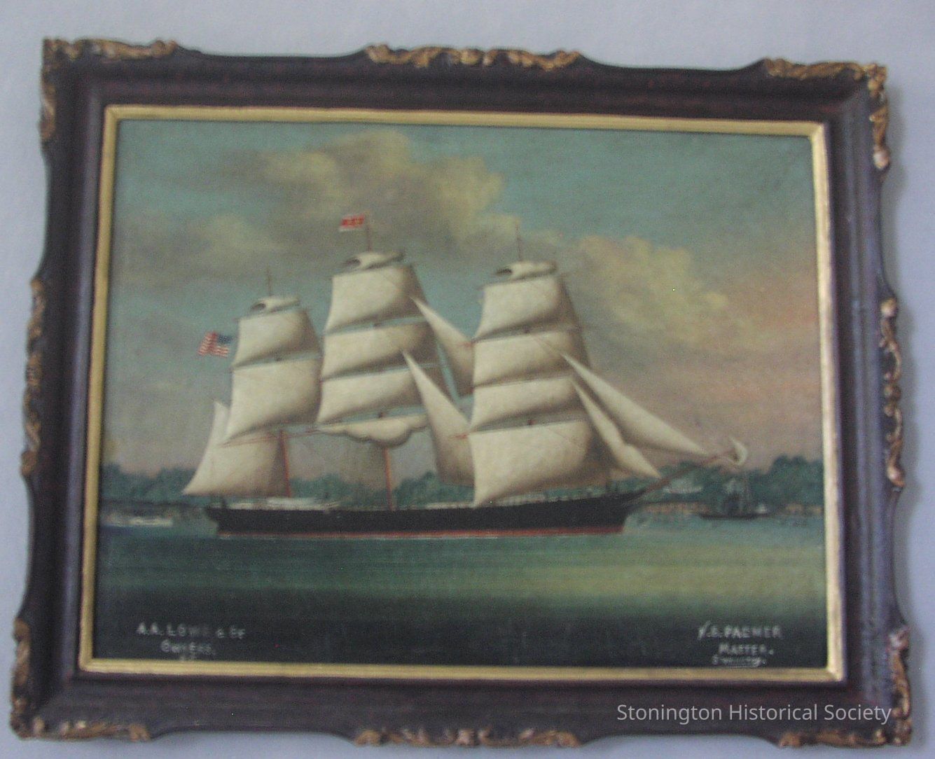 Framed oil on silk, 17-1/4 x 22-1/2", painting of the clipper ship Samuel Russell, c.1848, painted in China. Ship designed by Capt. Nathaniel Palmer for A.A. Low & Bro.(lower corner, left) "Nathaniel Palmer, Master" at lower right.Collection