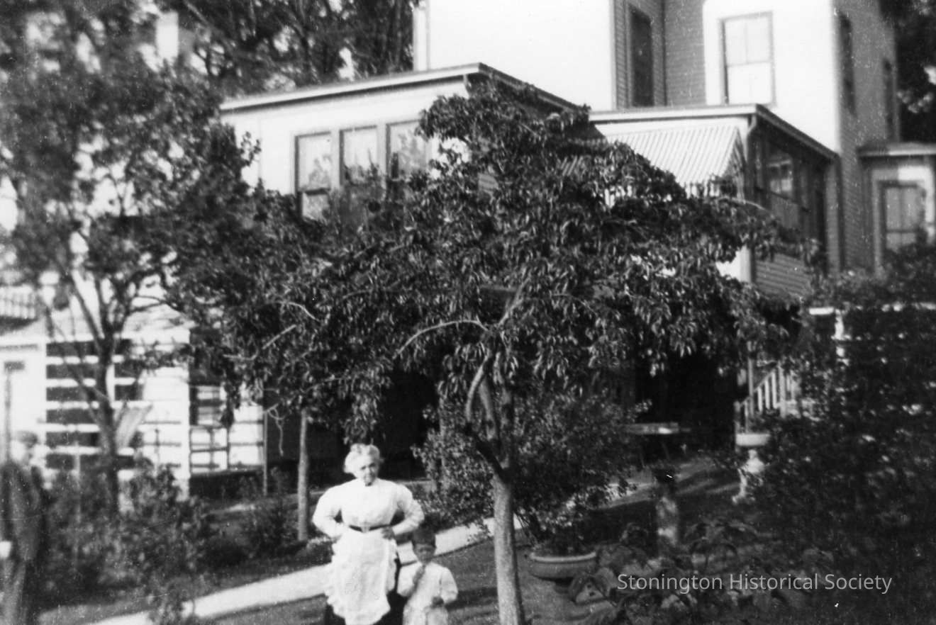 Emma Horn Anderson and her grandson, Robert P. Anderson in her garden behind their Water Street home standing beneath a large tree.
