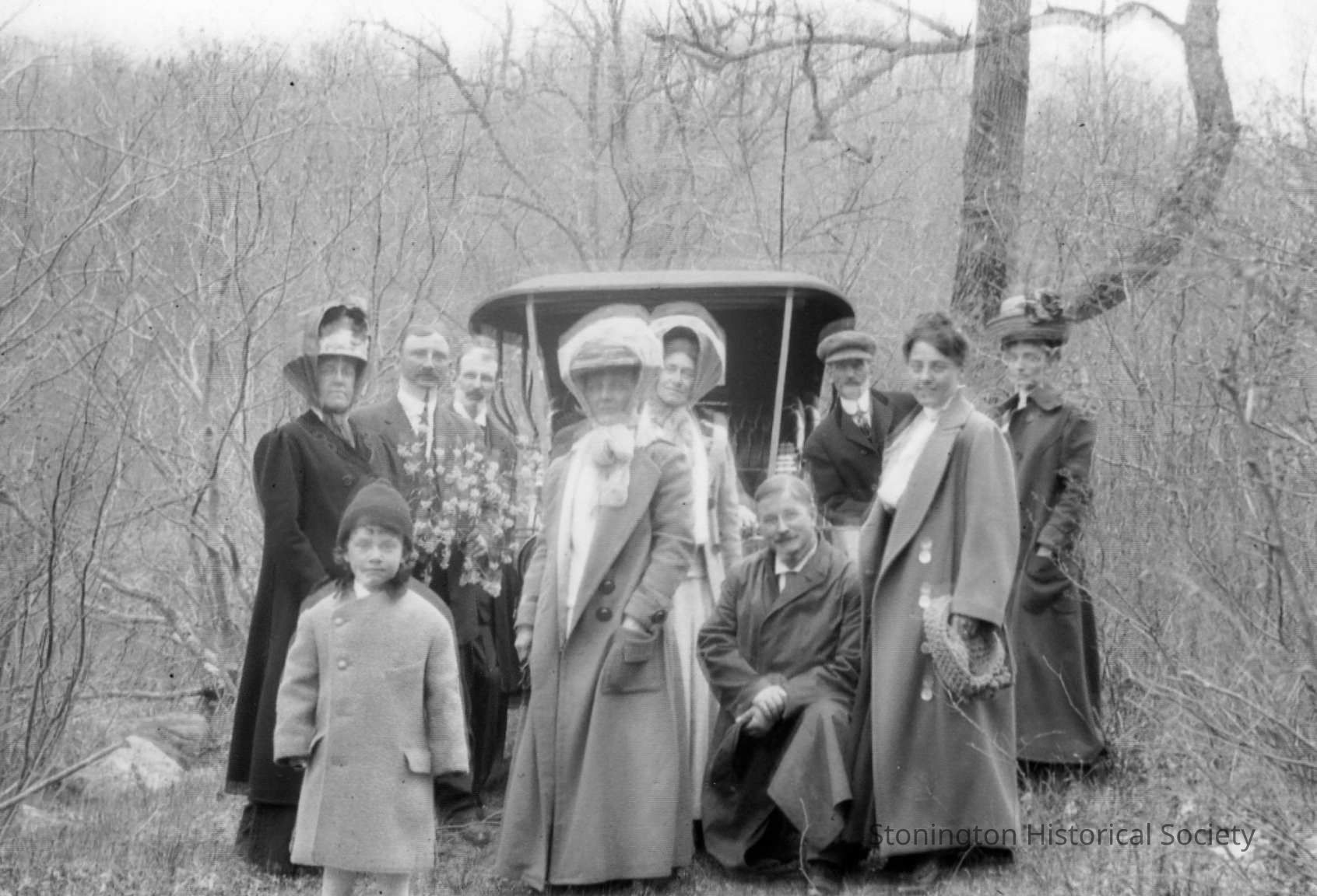 Group photograph in front of automobile in the woods. Jessie Ashby Anderson is in the front right in the long grey coat. This may be Jessie's family, as the rest of the people in the photograph are not identified.