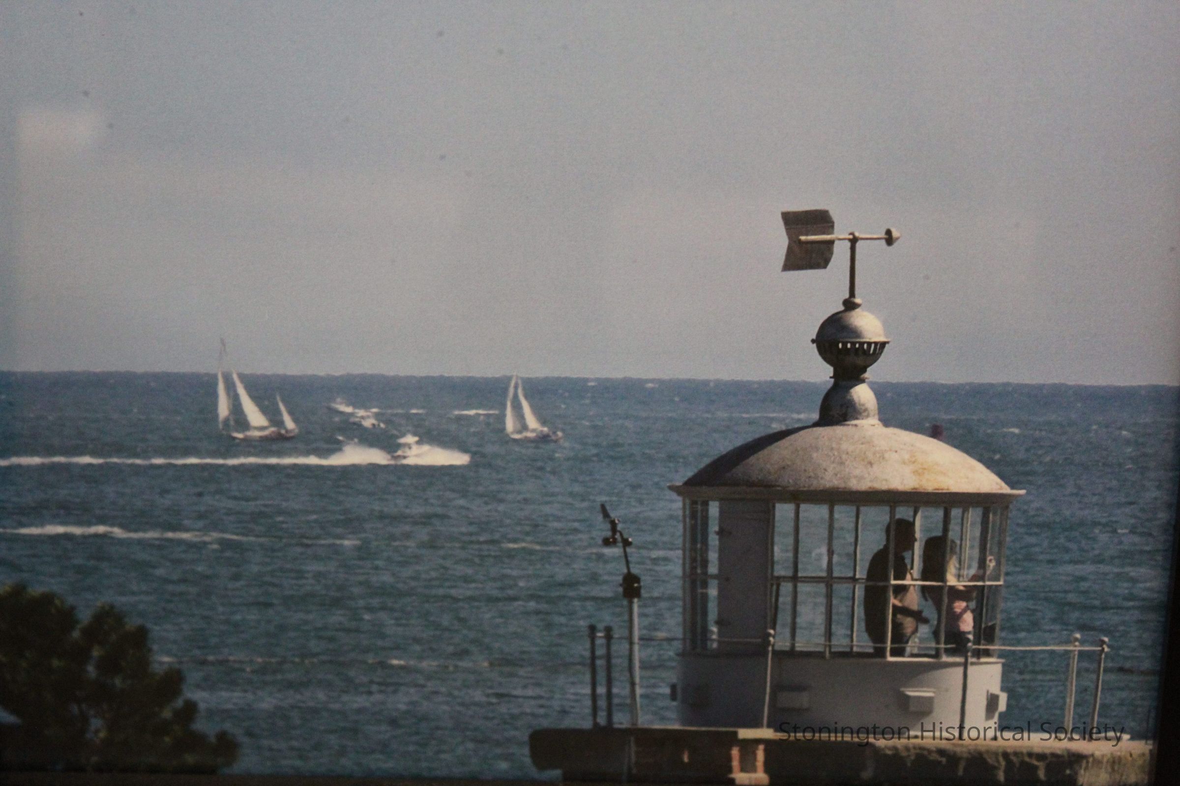 A framed photograph measuring approximately 8.5 x 11" of the Stonington lighthouse tower. A couple is standing inside and the woman is taking a picture. In the background, three sailboats and a powerboat can be seen.