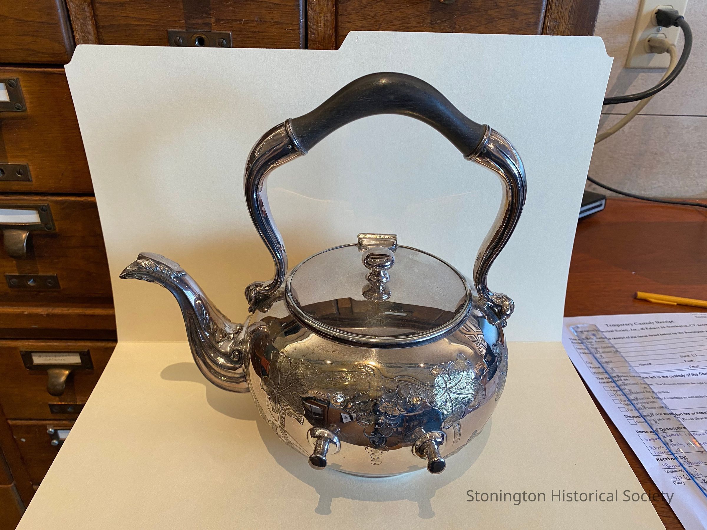 Sterling Silver teapot on stand, with stand warmer. Teapot has decorative grape leaf pattern and "E" etched into the sides and lid. Bottom of teaport stamped with "5 7 2 5", " * + * ", "BSCEP" and three maker's marks, with brown "Silver Sentry" drawstring bag.