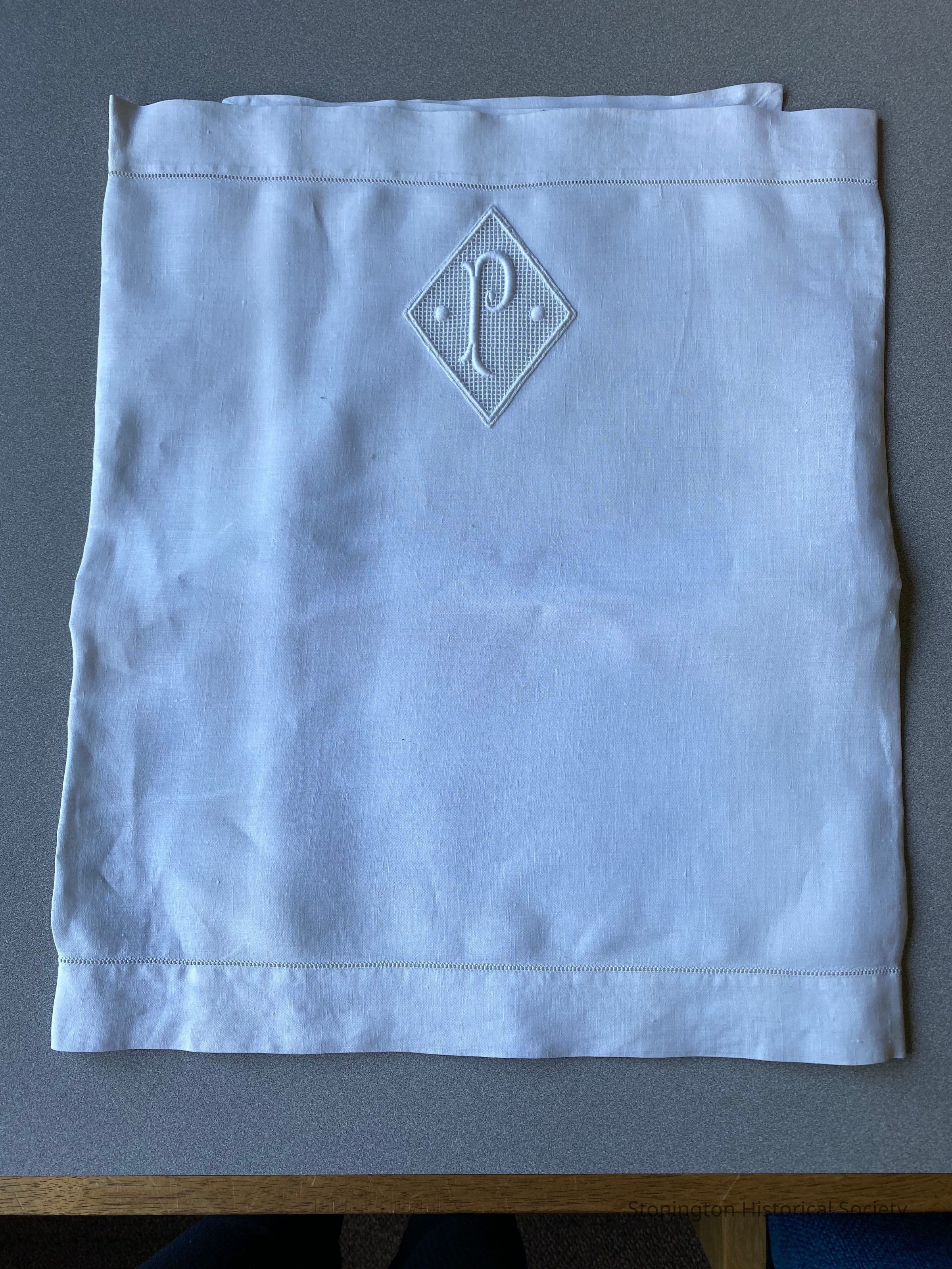 Table linen - white table runner, 18.5" x 43" with embroidered "P" for Paffard from Stone Acres, Stonington.