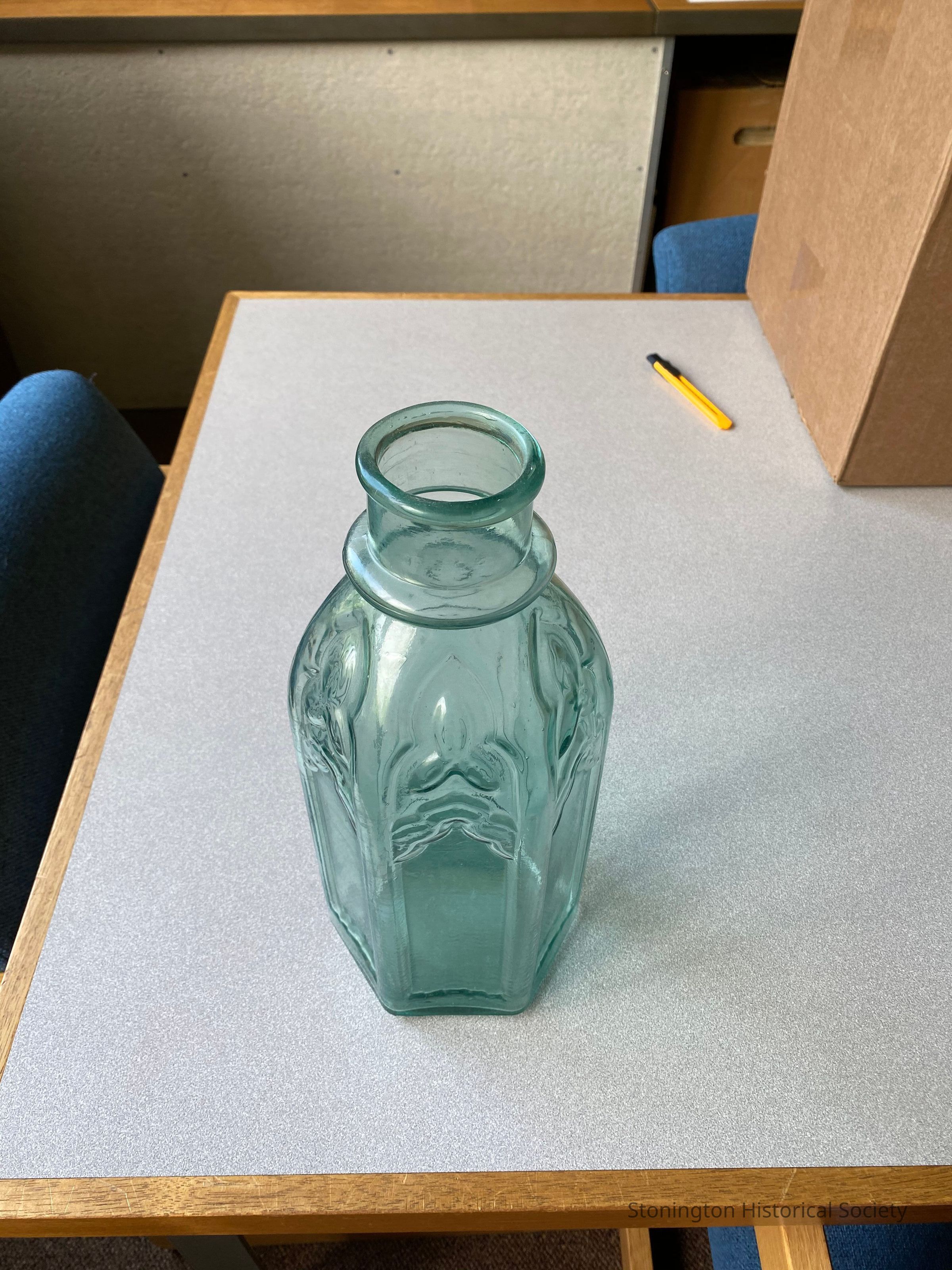 6-sided, blue glass gothic pickle jar, 13.5" x 5.25," from Stone Acres, Stonington.