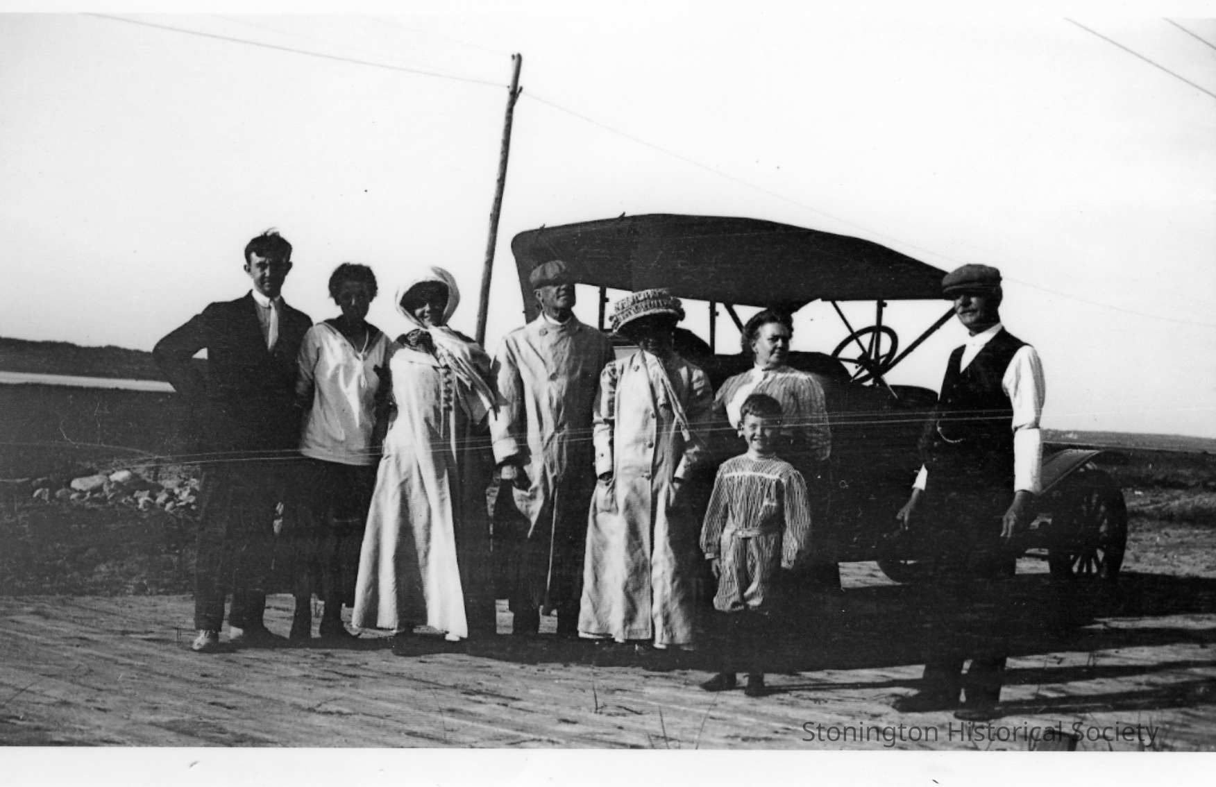 Anderson family with car at the beach. Arthur and Jessie are standing on the far left with their arms around each other. The other people are not identified. Robert P. Anderson is the little boy standing on the right, and Jessie's father may be the man on the right end.