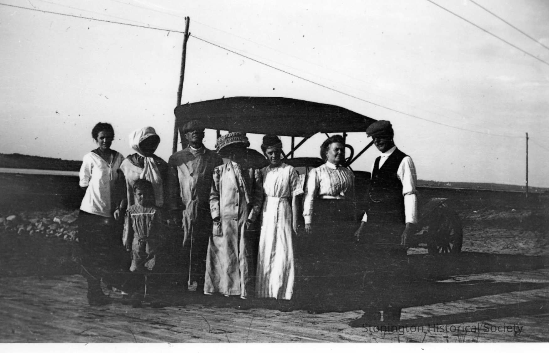 Group picture of family on the beach with their car. Robert P. Anderson is standing on the left in front, and Jessie Ashby Anderson is third from the right. This may be Jessie Ashby Anderson's family.
