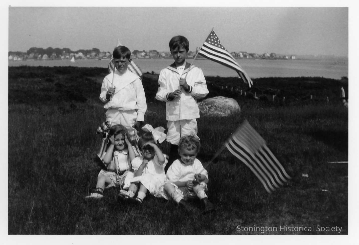 Group of children on Wamphassuc Point holding American flags. Probably taken on Fourth of July. From left to right: Margaret Anderson (? seated), Jerome Anderson III, unidentified little girl seated, Robert P. Anderson and Douglas Anderson.