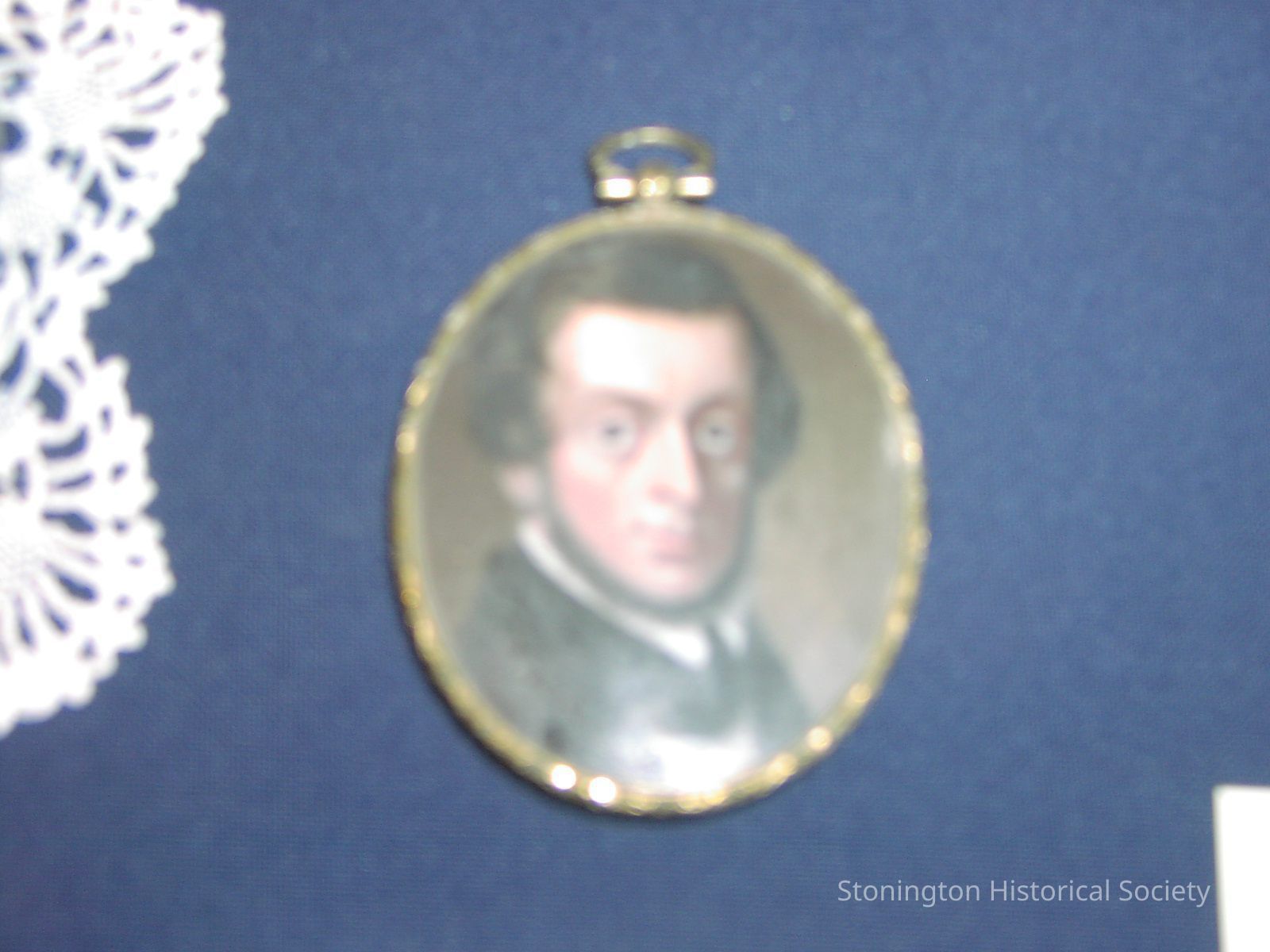 Miniature of an unknown man. The man is facing towards the viewer's right. He sits against a tan background. He has brown hair, a beard and is wearing a dark coat with a white collar. Framed in an oval frame with hanging loop.Collection