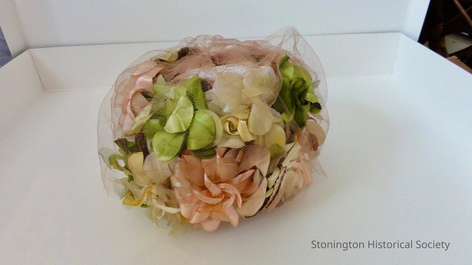peach, yellow, green and tan 3 inch fabric flowers adorn the entire hat