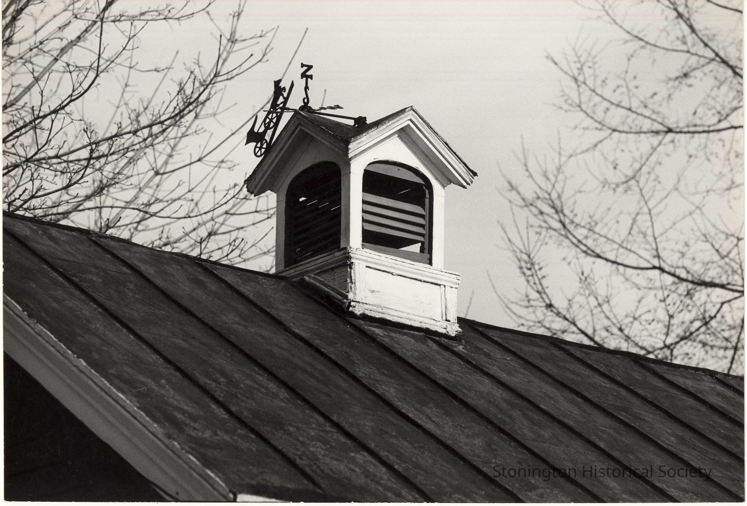 Small tower on building with weathervane and horse and buggy