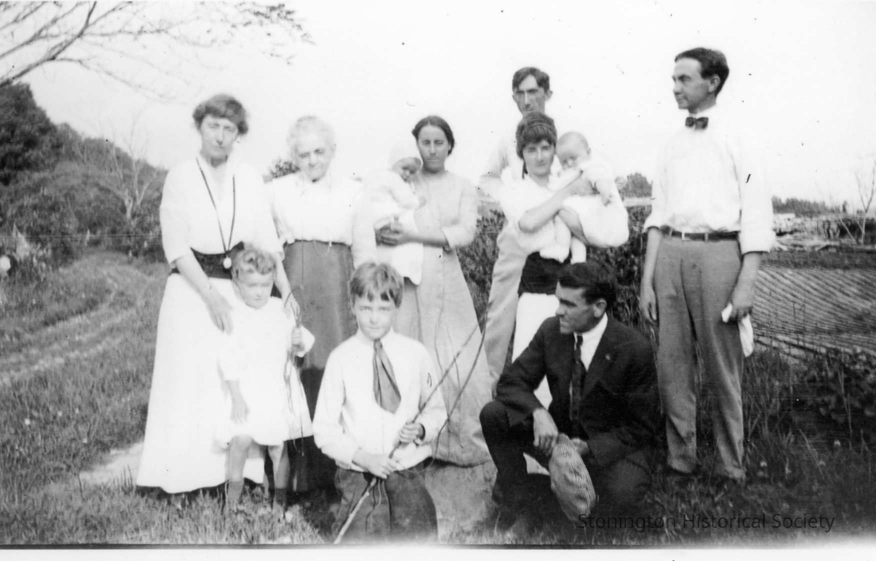 Anderson family picnic, probably taken around 1912. From left to right, back row: Emma V., Emma H., baby Doug being held by Libby Fitch Anderson, Jerome II, Jerome's wife and baby (?), Arthur. Left to right, front row: Jerome III, Robert, Charles.