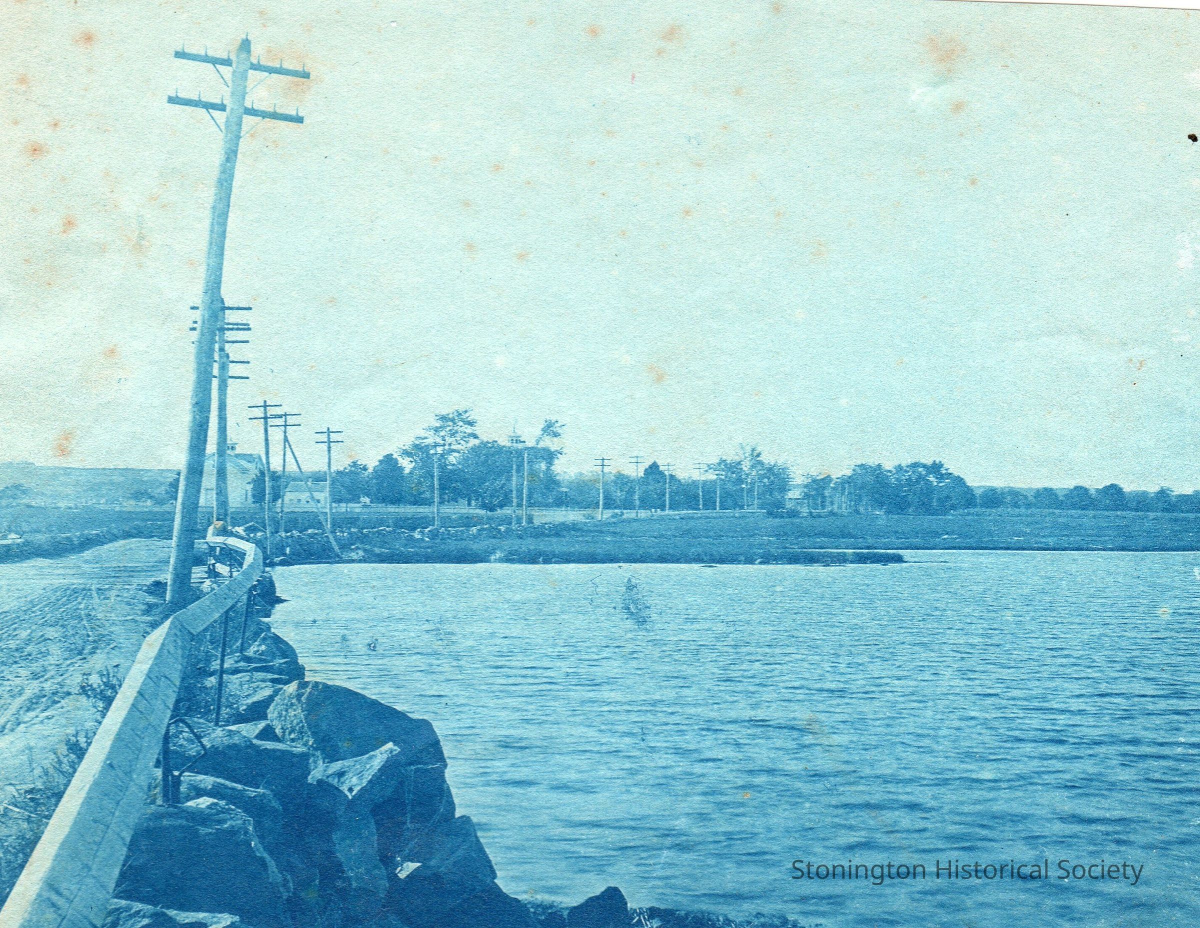 Cyanotype with color photo enlargement, view of the Pine Point bridge along Route 1. Given to the Society by Harry Northup before his death. With note: "This is a view looking Northwest along route one, at the Pine Point Bridge. The barn and little house was part of the Spaulding farm. The meadow is full of houses today. Montauk Ave. is located on the hill in the far background. Note how treeless the hillside was at that time. The land on the right side of the telegraph poles is where the golf course used to be. Today it too is full of houses. You can see the cupola of the main residence just above the tree tops."Collection