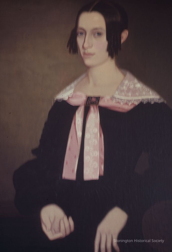 Oil portrait of Mrs. Thomas Burtch (Harriet Miner) (1818 - 1875) attributed to Orlando Hand Bears (1811-1851). Daughter of Asa and Hannah Miner, born 8 January 1818, died 2 February 1875. Gift of Mrs. Jennings of Quiambaug, Stonington.