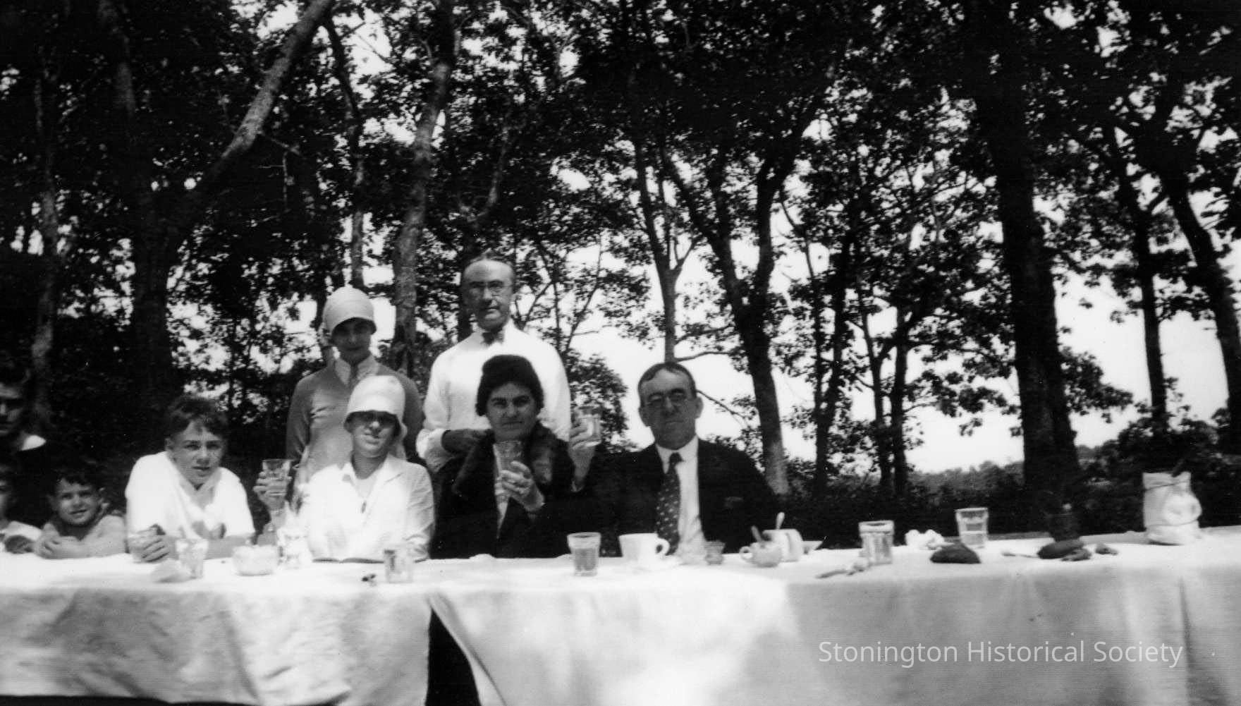 Group photograph of adults and children at a set table outside. Could be a sort of formal picnic. Arthur Anderson is standing in the white shirt. His wife, Jessie is sitting in the white dress and white hat. Ashby, her son is next to her. Robert, her oldest son, is all the way on the left in the black shirt.