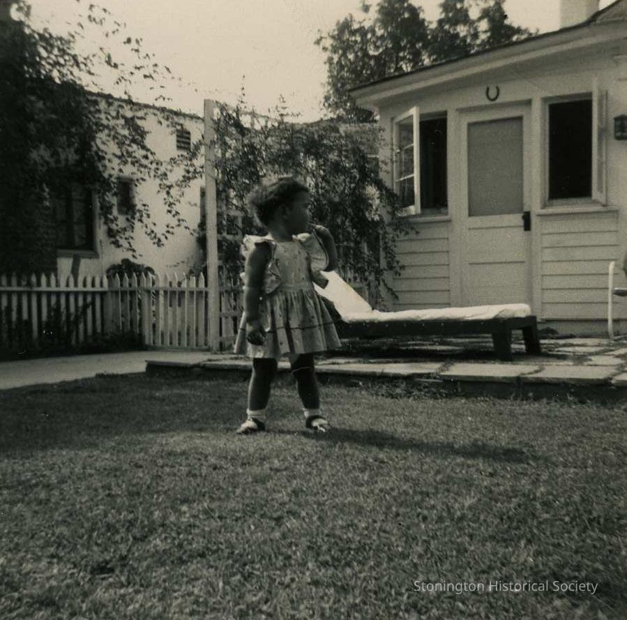 Dawn Mary Lockwood, a descendant of the Stonington Andersons. She is standing in her yard around the age of two. Photograph has been labeled by donor and was taken in July of 1951.Collection