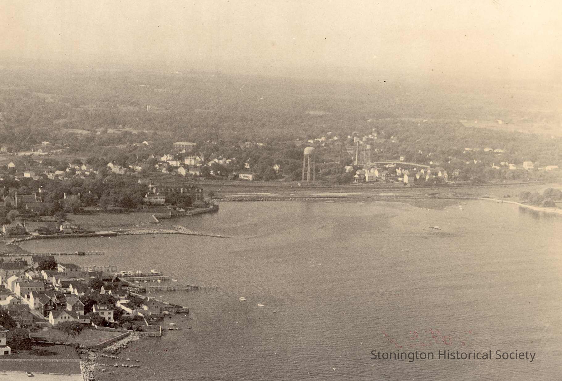 Aerial view of Stonington borough from the Point overlooking Little Narragansett Bay showing water tower in background.