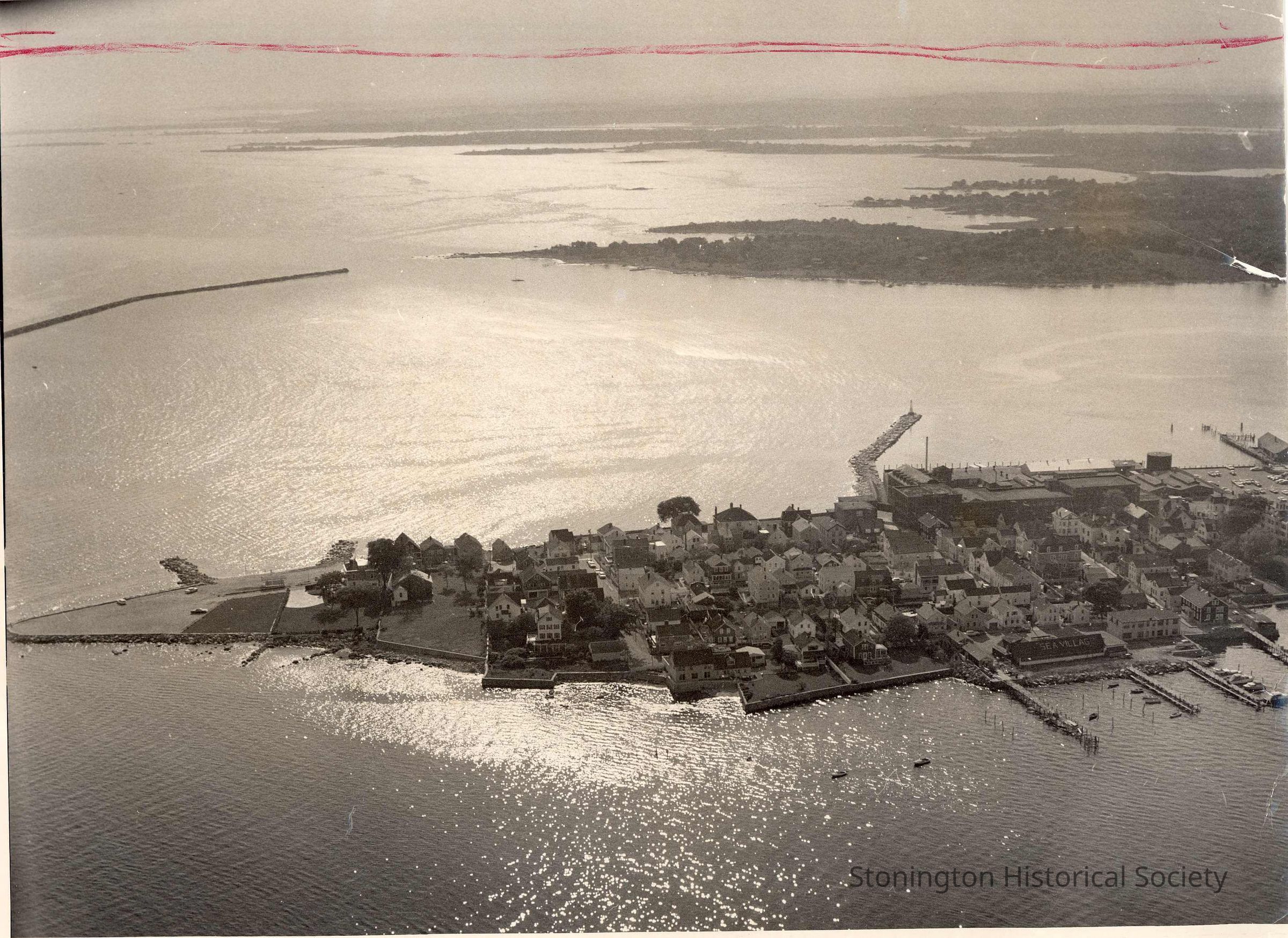 Aerial view of Stonington borough from Lilttle Narragansett Bay looking toward Wamphassuc Point
