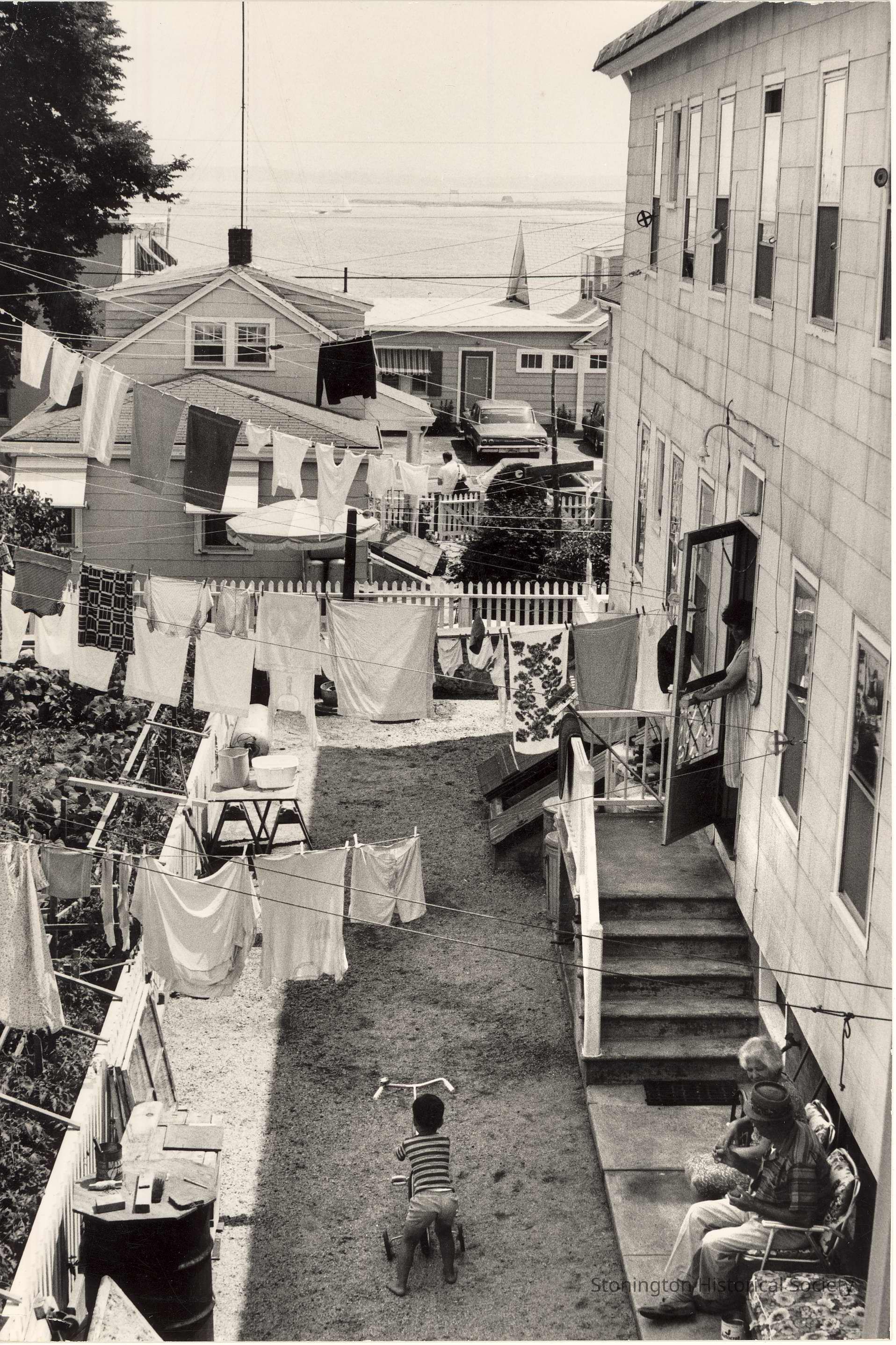 Backyard of home between Trumbull and Diving Streets showing laundry hung out to dry with Sandy Point in background.