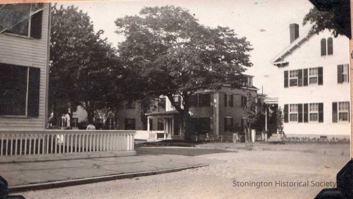 Photograph from the album, "The photographic life, moods and friends of Dorothea Hewett Gould, 1907-1942" (2002.0613.018). 11 and 13 Main Street photographed from Canon Square, Stonington Borough. "Our house in 1923 before painting done. Gardiner's house in rear, Trumbull house at right. Fence at left is still standing in 1971."Collection