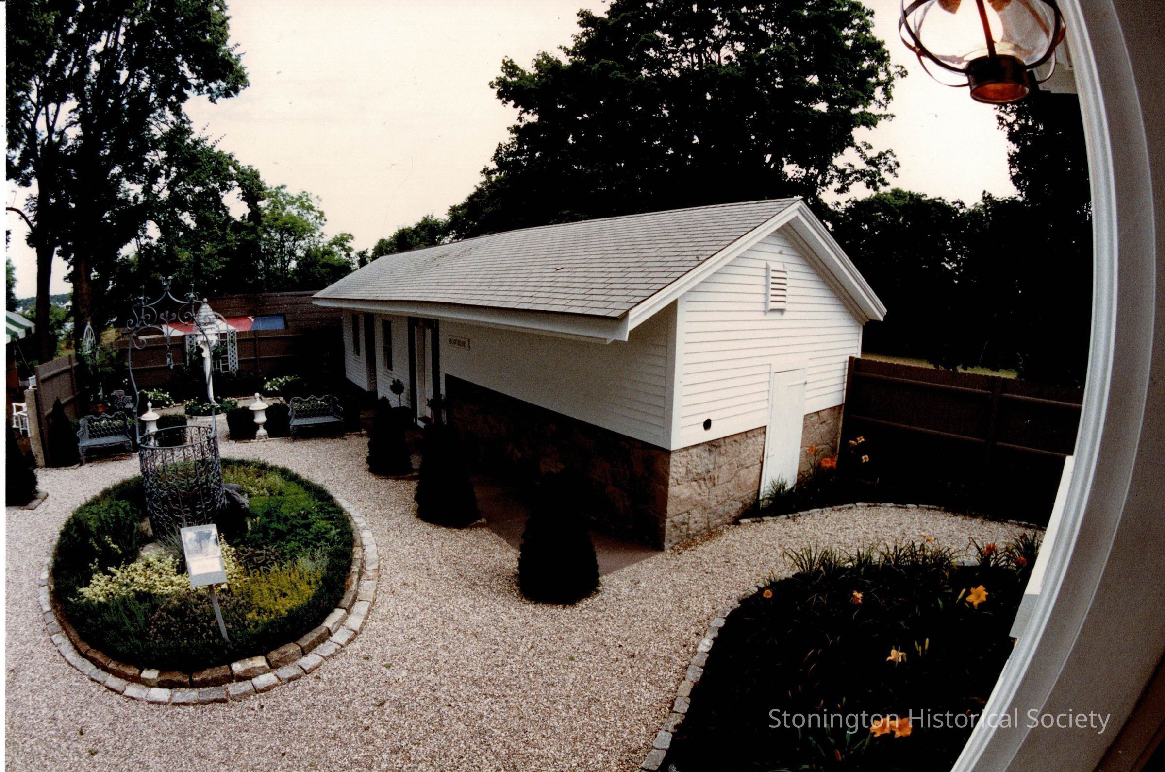 View of “Herb Garden” in the Palmer House service yard, as it was for the Designer’s Show House in 1989. The herb and ornamental gardens were designed by The Herbery at Rattleberry Farm, Hadlyme, CT, R.J. Vickers, A.B., M.S. On the right are the ice house, workshop and privy buildings. The chicken coop roof is visible behind the far fence.Collection