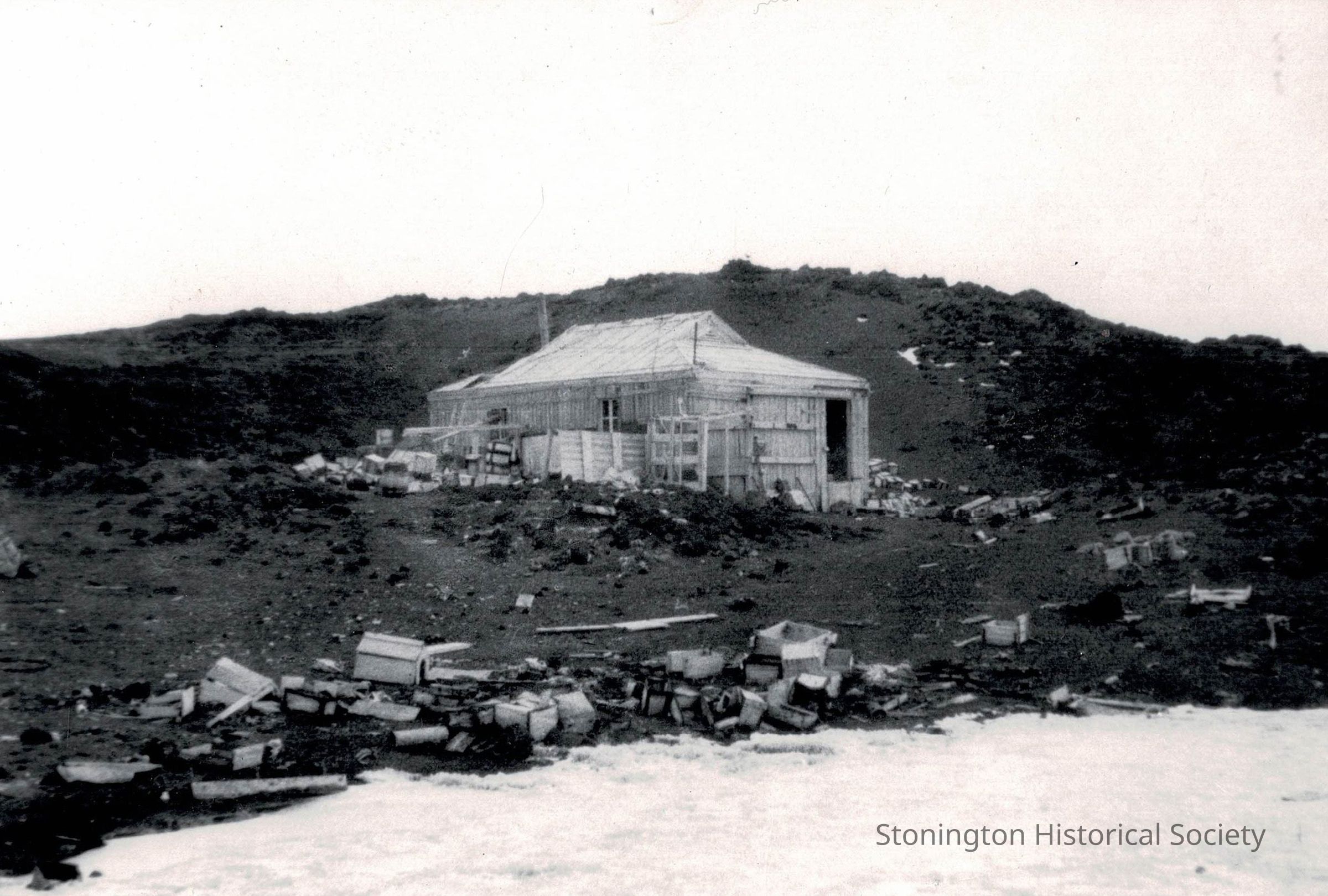 Black and white photograph of Ernest Shackleton's hut at Cape Royds, Ross Island, Antarctica. The photograph was most likely taken by Conrad Larson, US Navy, in early 1956. The image was donated to the Stonington Historical Society, by his widow, Anna Larson of Peterborough, NH in August 1995.Collection