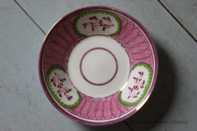 Pink Lusterware (w/green) saucer. Total of 9 saucers, labeled A through I.