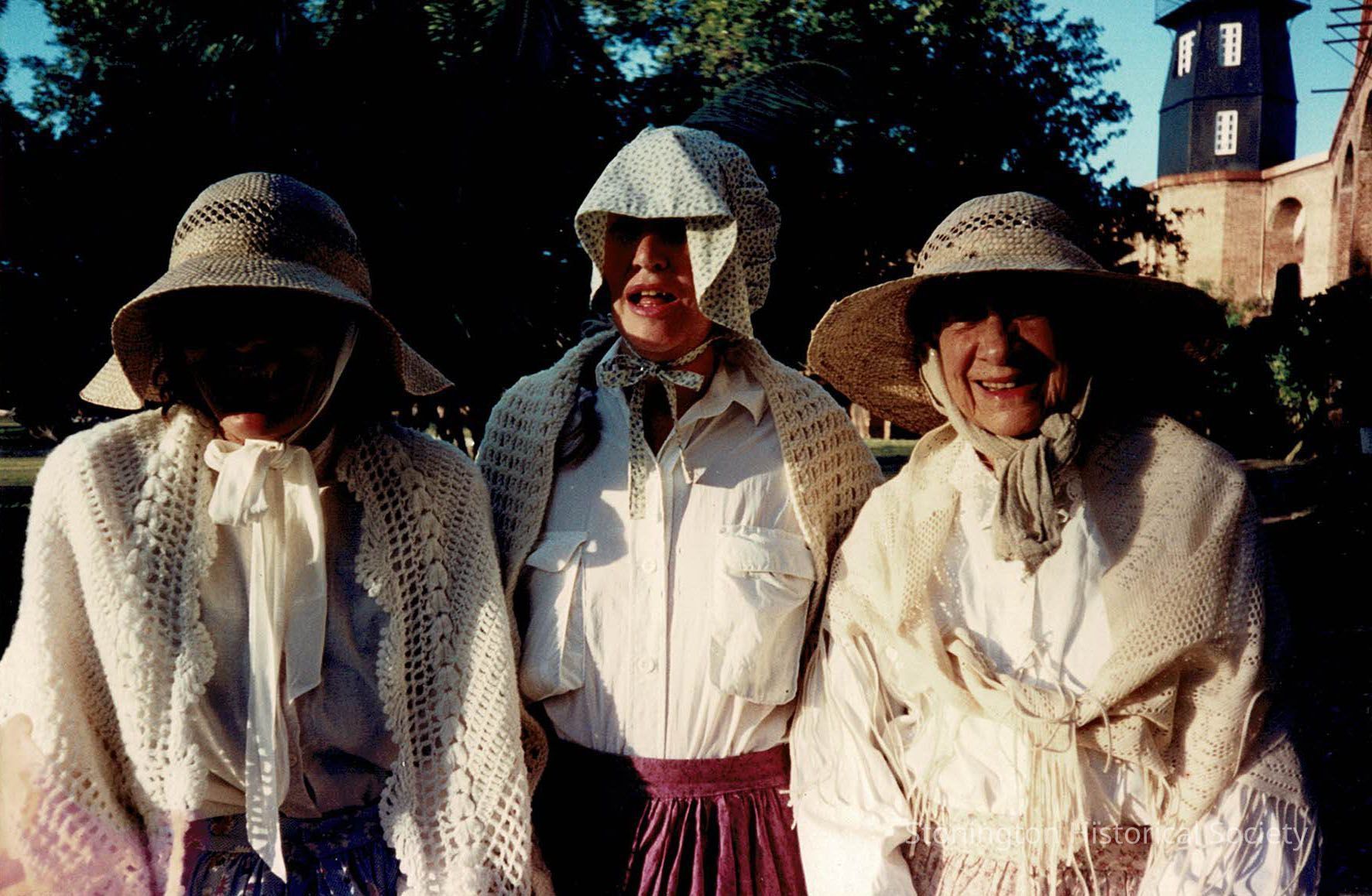 Photograph of Rollie McKenna, Annie and Joy William at Fort Jefferson, FL in April 1996. The three ladies are dressed in period costume.