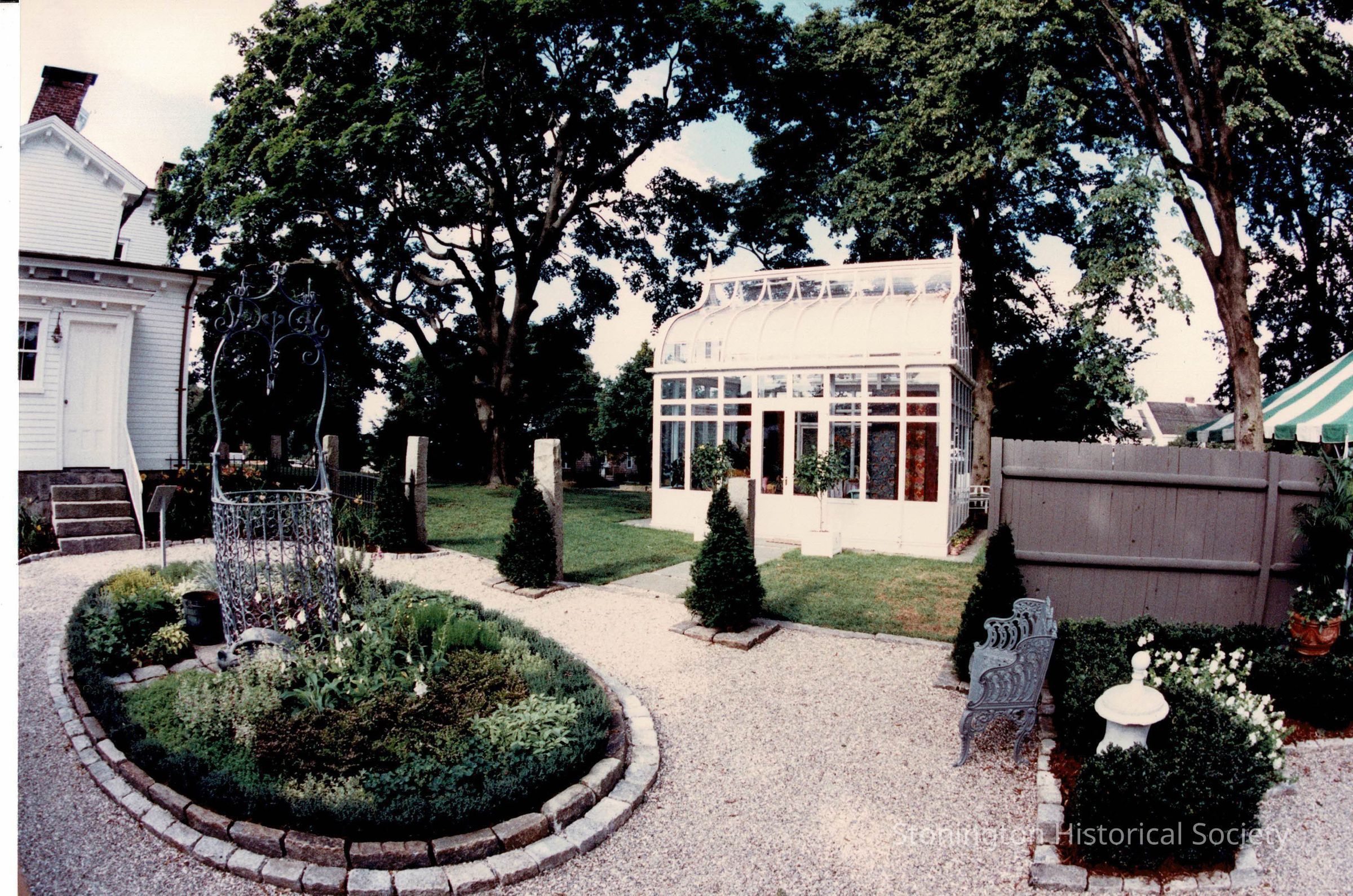 View of “A Summer Place”, as it was for the Designer’s Show House in 1989. A Summer Place was designed by Arnold Copper and William Strohm of Madison Avenue, NY. It was placed on the west side of the service yard, and removed after the Designer's Showhouse. This view shows a bit of the herb garden, and the back door of the Palmer House at the far left.Collection