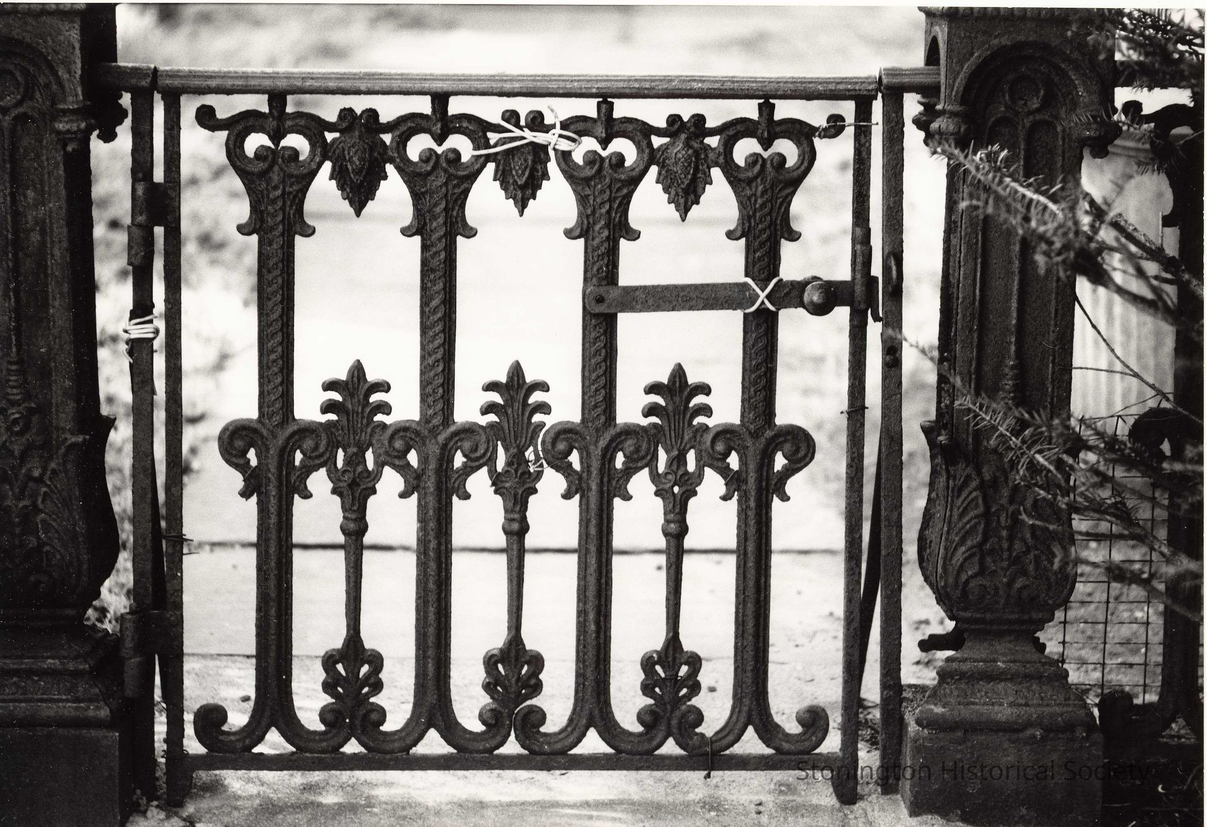 Close up of cast iron gate held together with string.