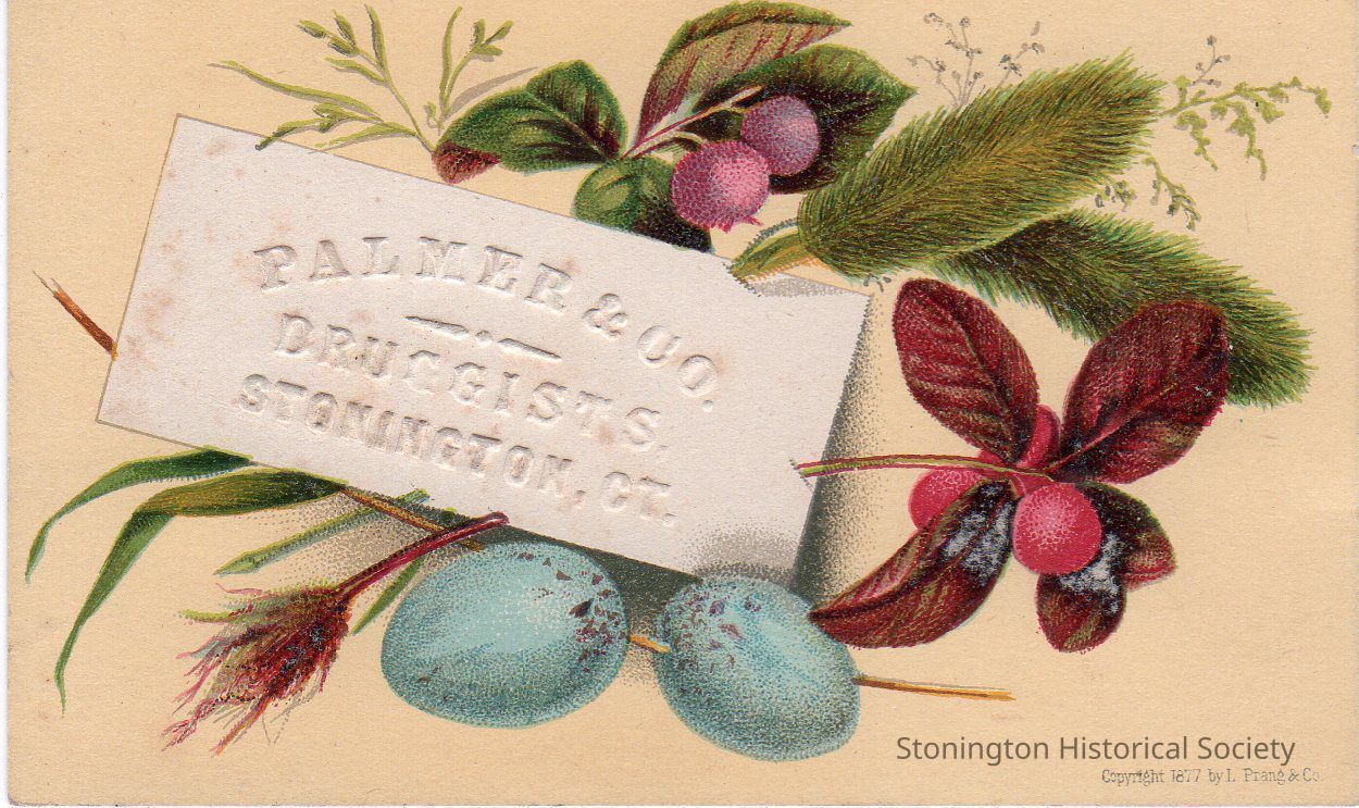 Trade card for Palmer & Co., Druggists, Stonington, CT, c. 1877. Palmer & Co. was located at 151 Water Street in Stonington Borough and sold "drugs, chemicals, patent medicines, toilet and fancy articles, sponges, brushes, perfumery, stationery and school books, confectionary, cigars and tobacco."Collection