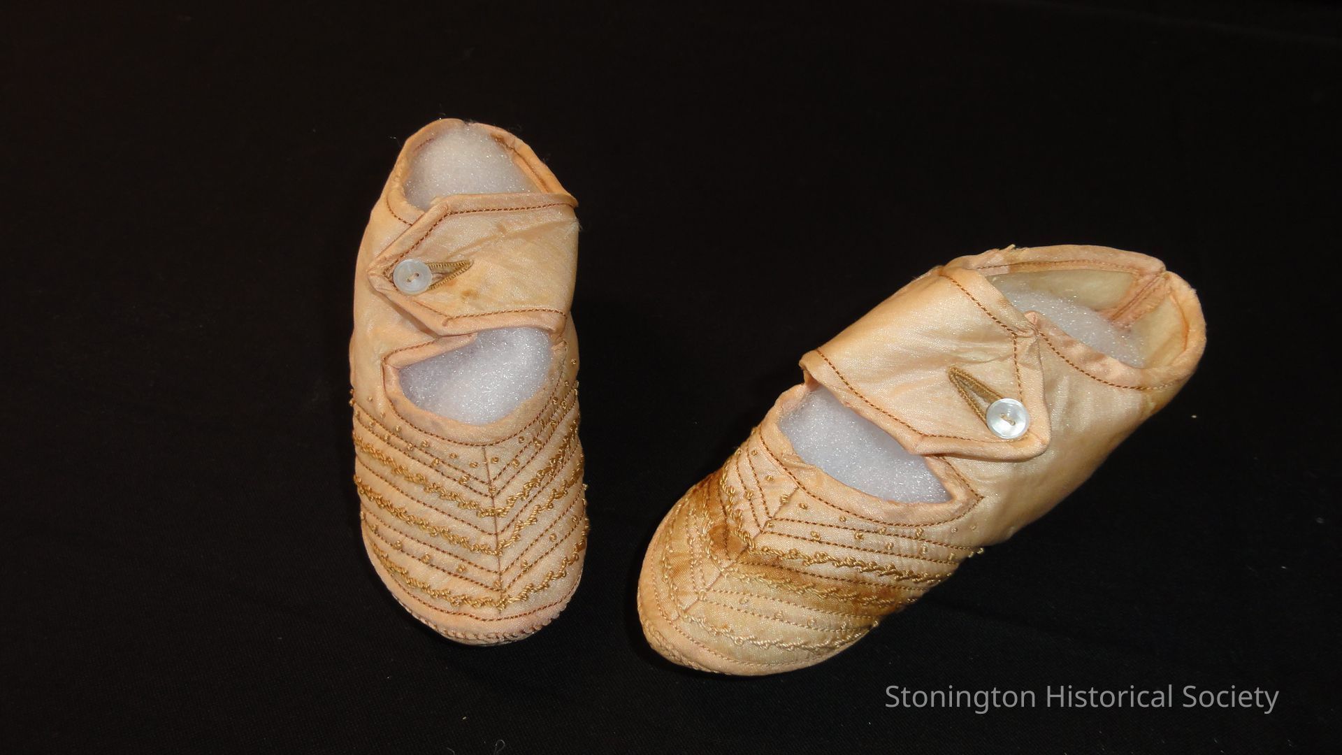 Infant Booties peach color silk booties with one button closure machine made white leather soles decorative stitching on front