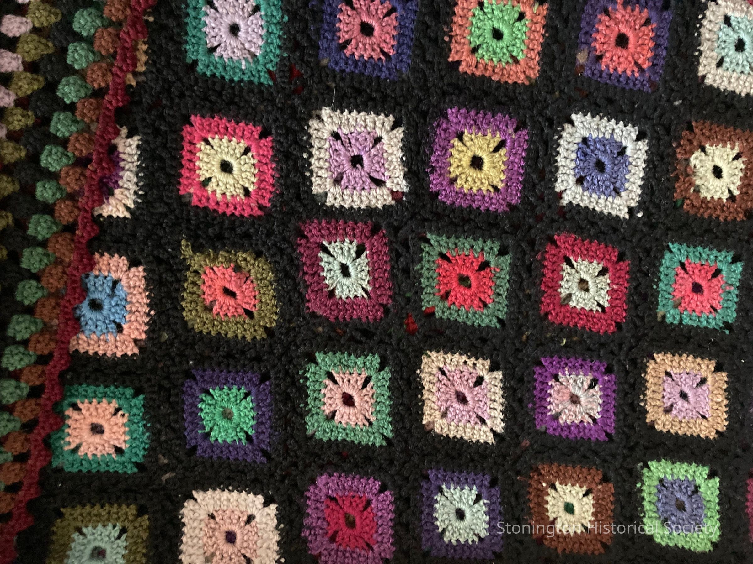 Colorful Afghan of crocheted Granny Squares.with a 3 inch border of crochet