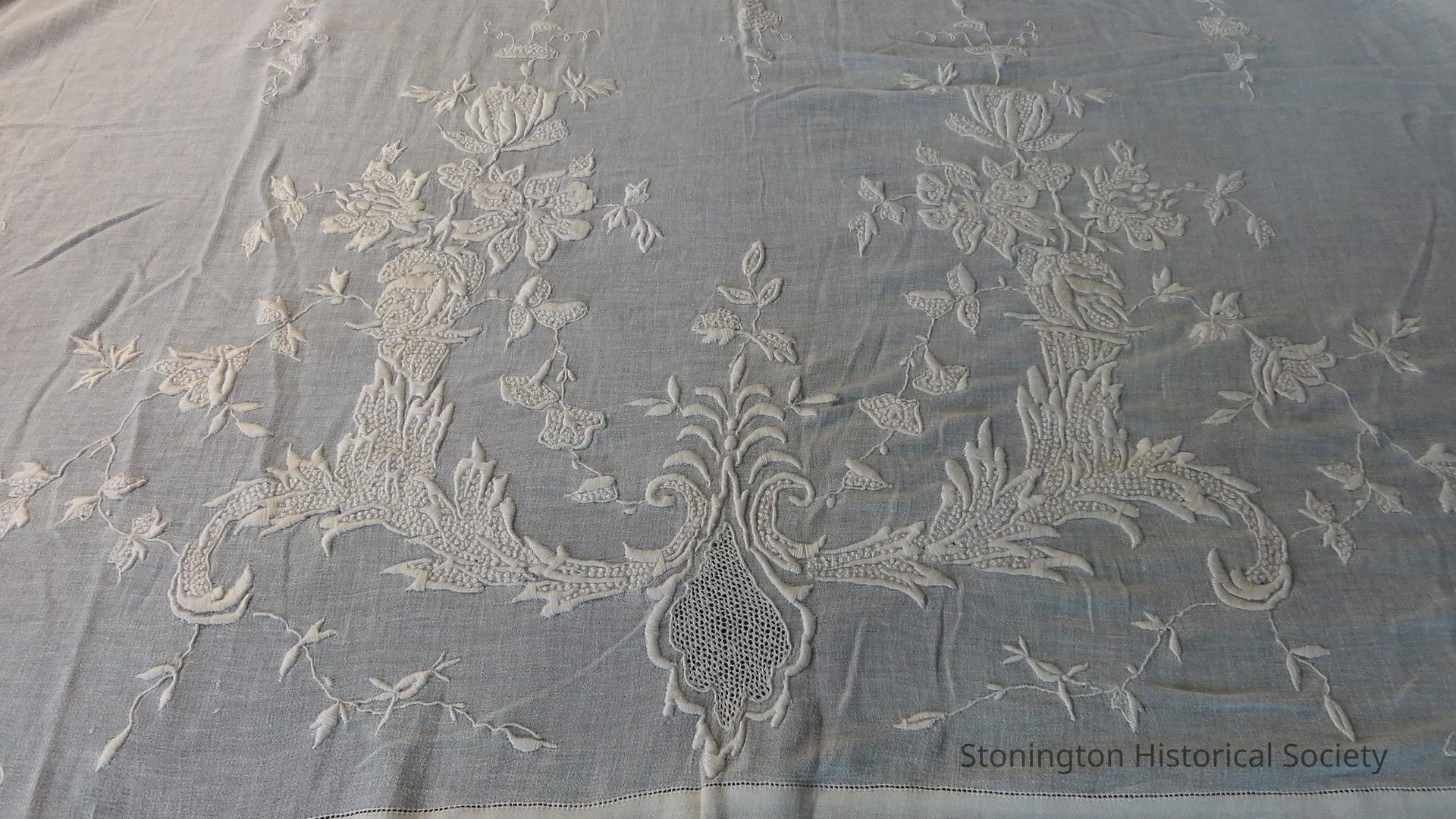 a-panel: cream color guaze-like flexible fabric with hand embroidered floral design 16X14 inches, salvedge edge both sides of panel, bothends have been cut