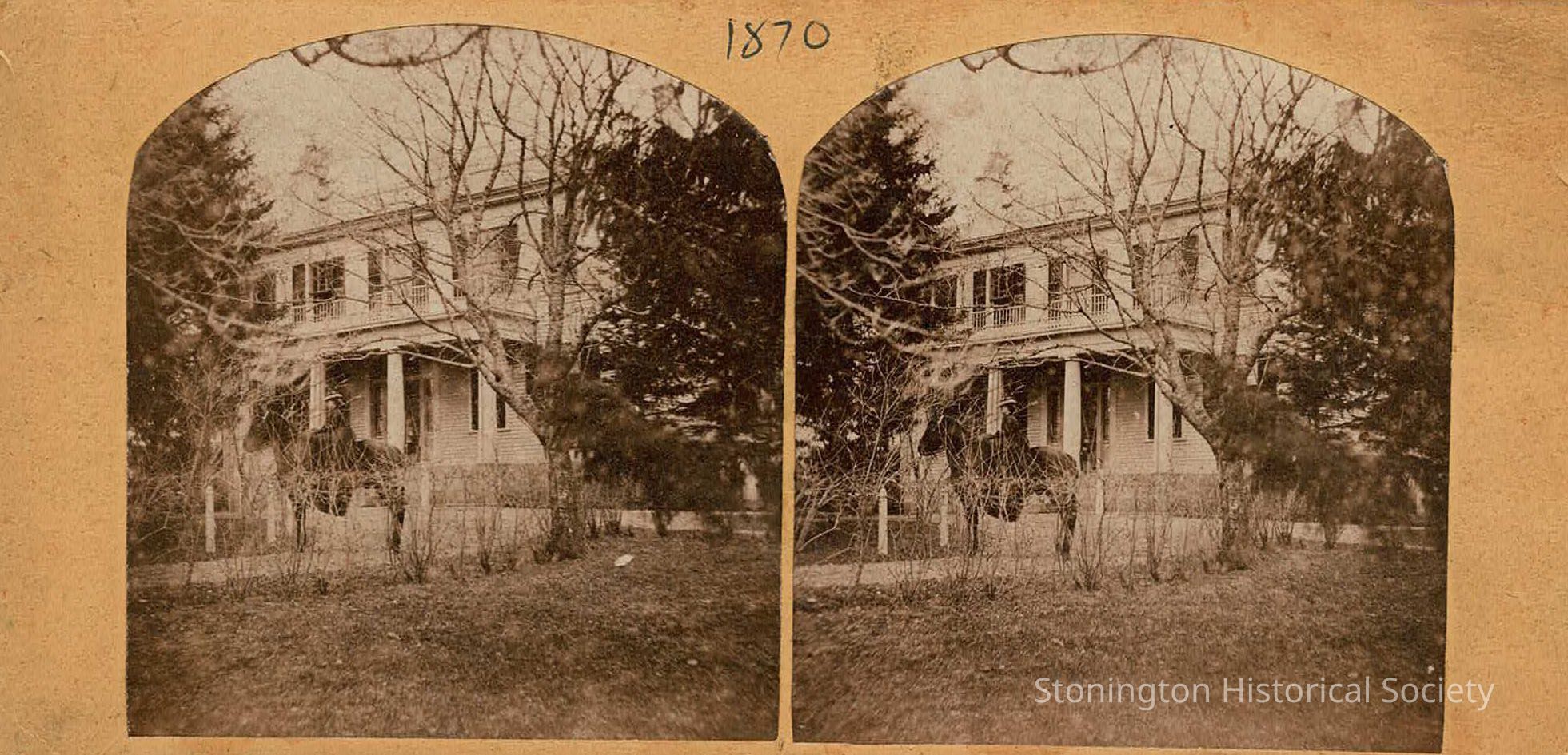 A stereograph showing the exterior of Stone Acres in 1870. A woman is mounted on a dark horse in the driveway. This is most likely Elisabeth T. Edwards, daughter of Ellen Phelps and Eugene Edwards.Collection